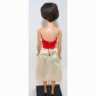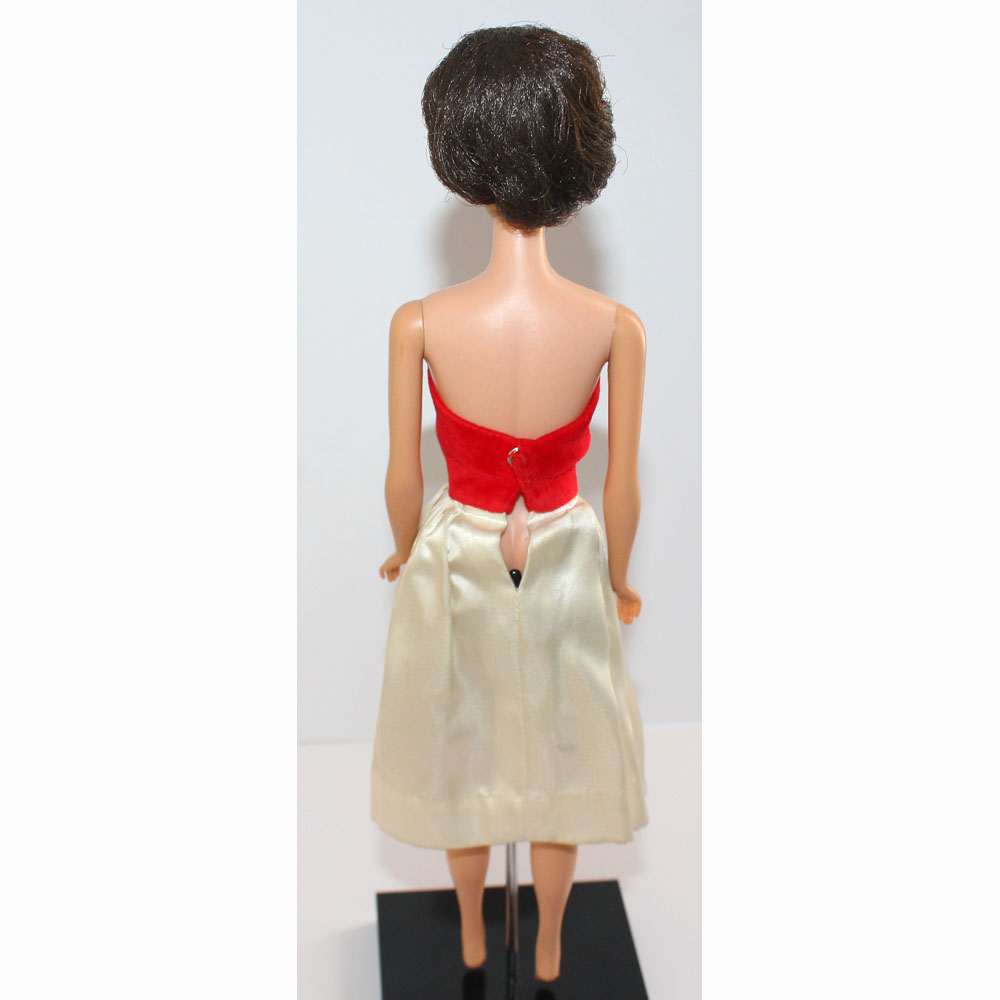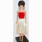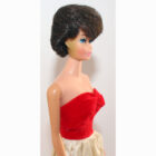 Brunette Bubble Barbie. Her hair is very nice, has not been cut and there are no missing hair plugs.ย She has a body with most foot and nail polish. She has light color washed bubble gum pink lips and wears a EC Silken Flame dress. Ears have been green treated. EC.