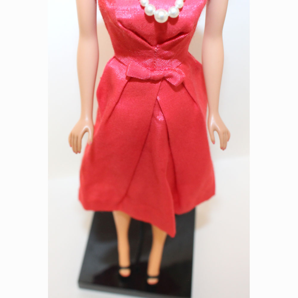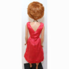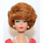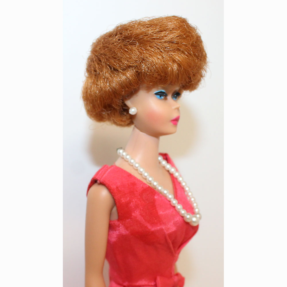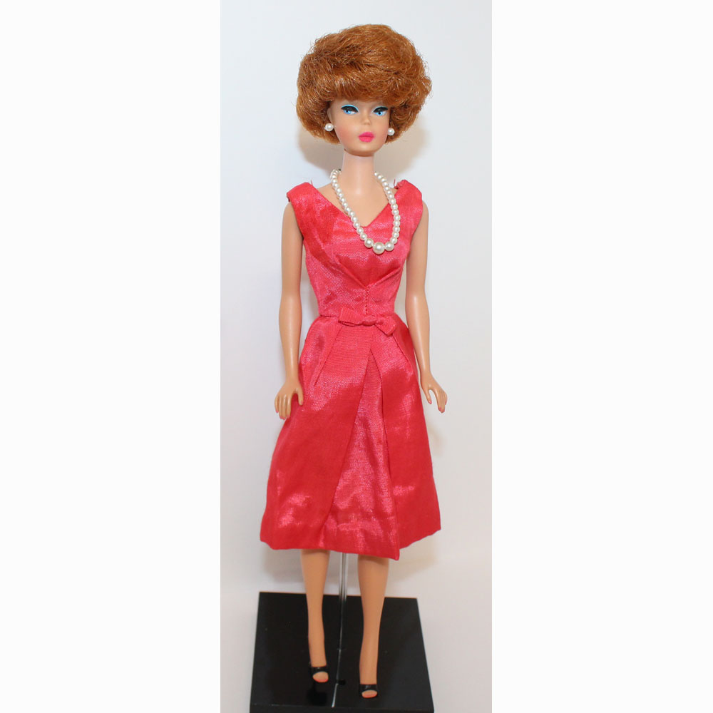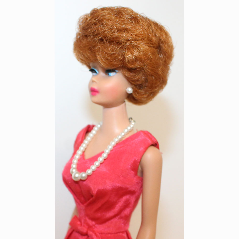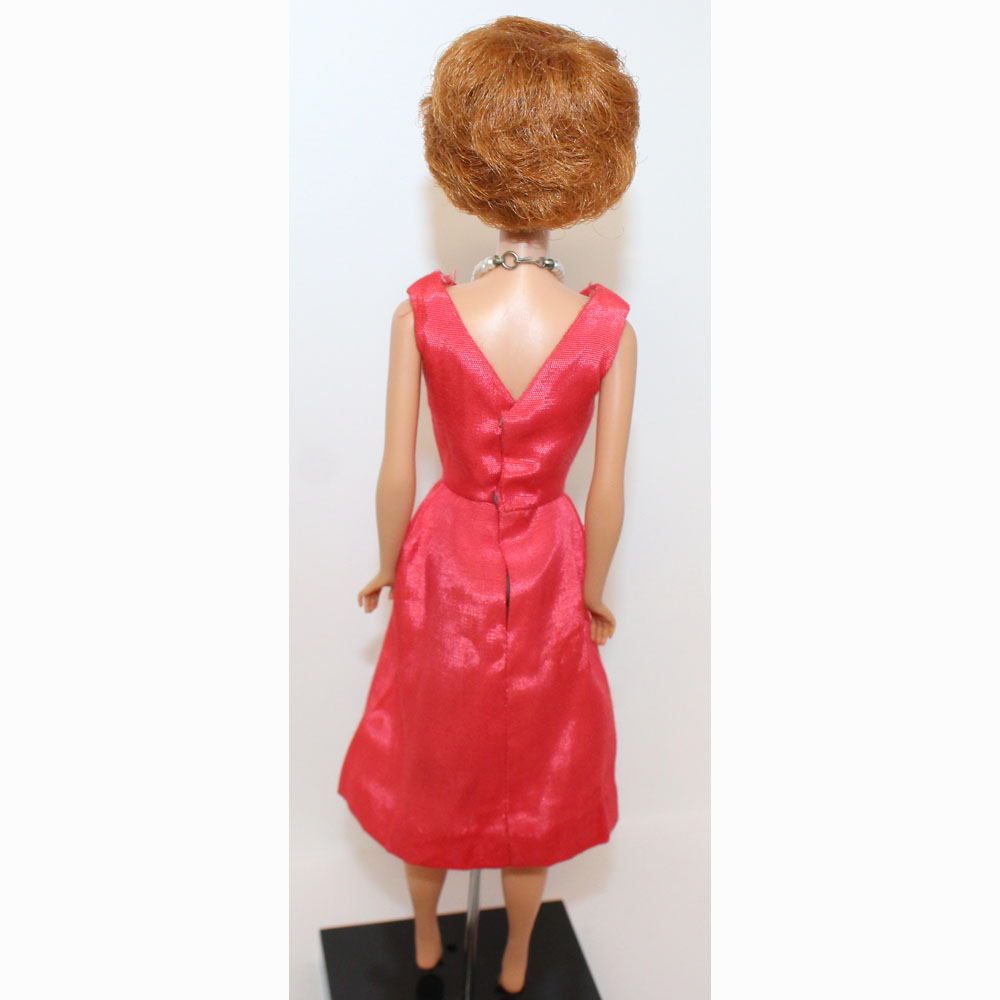 This is a Vintage Titian Bubble Cut Barbie. Her hair is very nice and full. It has not been cut and there are no missing hair plugs.ย She has a great body with all foot and nail polish. She has very nice color washed coral lips. Her makeup is perfect with no retouches and she is wonderful! She is dressed in a MINT Coral Campus Belle Silk Pak dress.ย