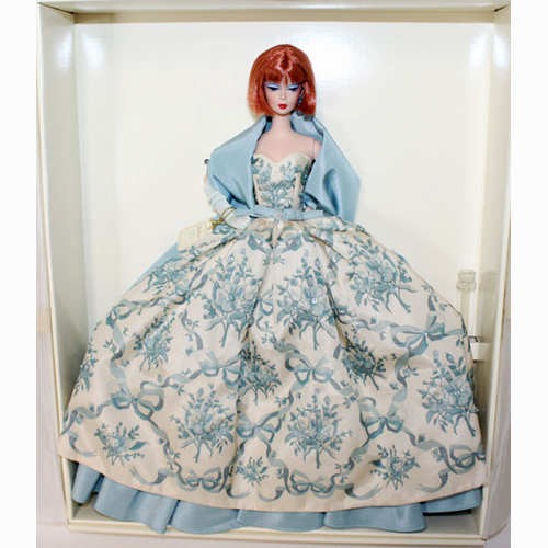 Provencale™ Barbie® doll turns heads in this exquisite floor-length ivory gown with pale blue detailing and a blue tulle underskirt with taffeta trim. A flowing pale blue stole drapes about her shoulders, complementing her striking red hair, styled elegantly in a page-boy reminiscent of her vintage ancestors. A finishing touch to her outfit includes blue opera gloves. NRFB. Excellent condition.