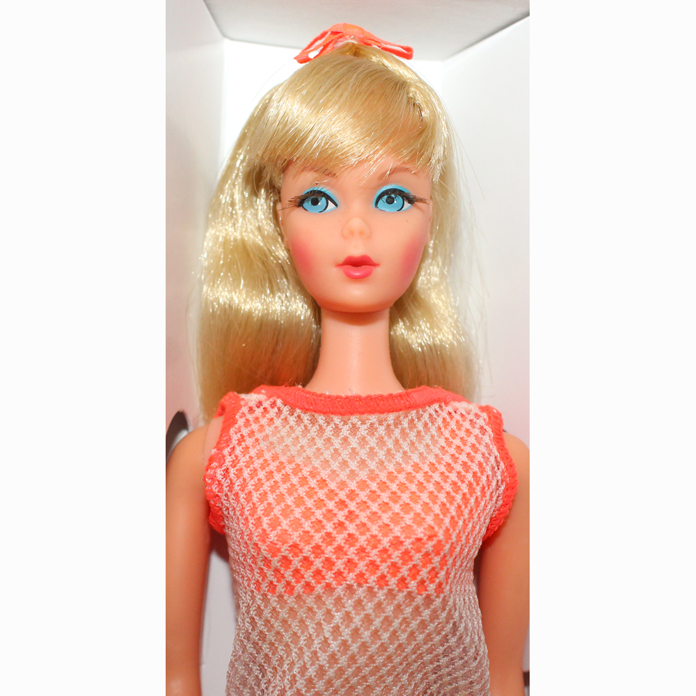 The beginning of the Mod Barbie Era. Barbie received a total makeover – a new face, a new hair style and a new body. The TNT Barbie has bendable legs, rooted eyelashes, and a twist and turn waist. There was a different swimsuit for each year and 2 different hairstyles….. one with a cute small ponytail with long hair hanging underneath, and a Marlo flip.