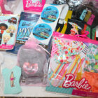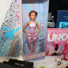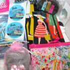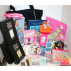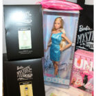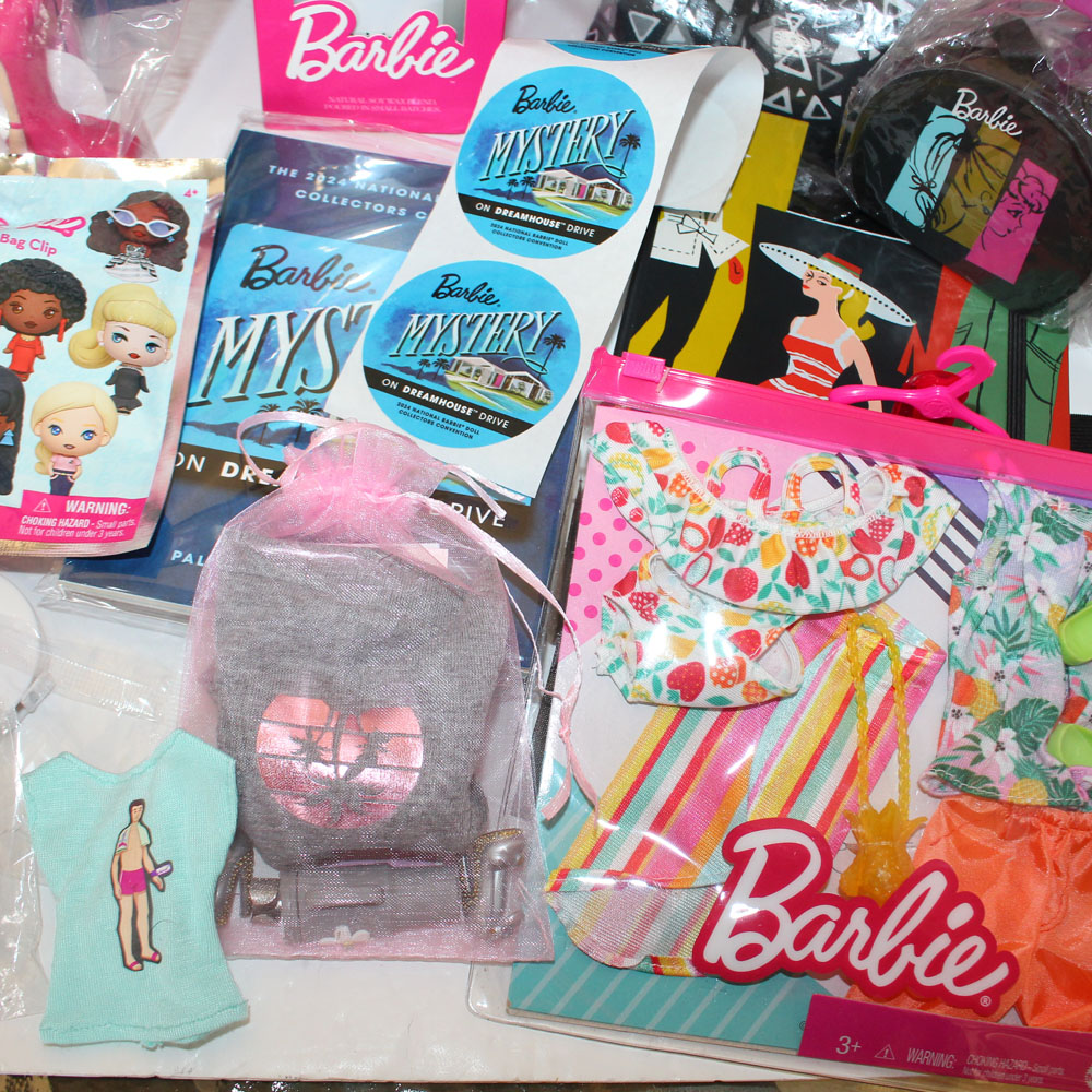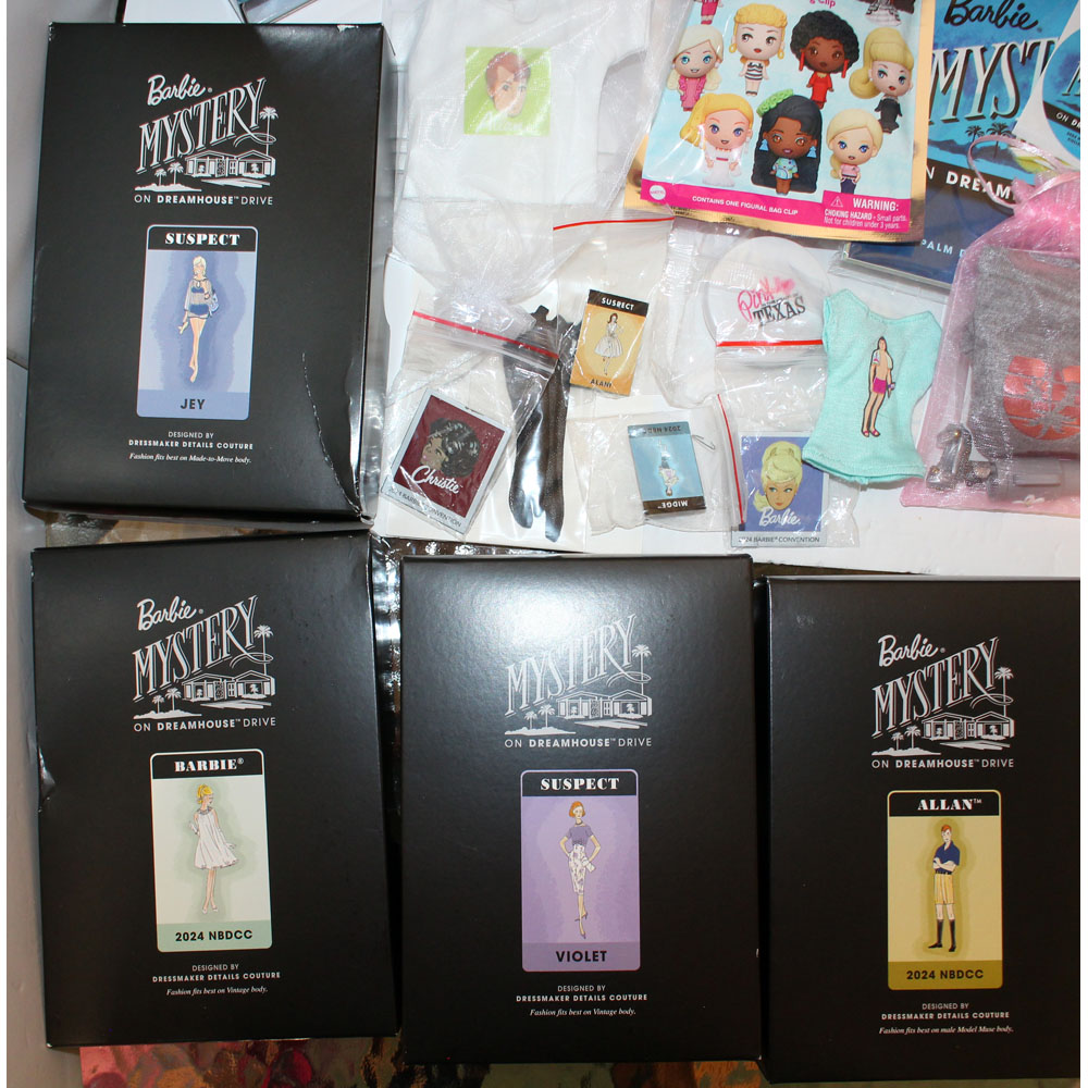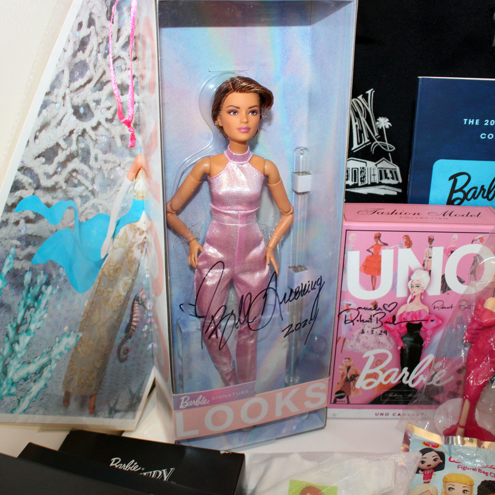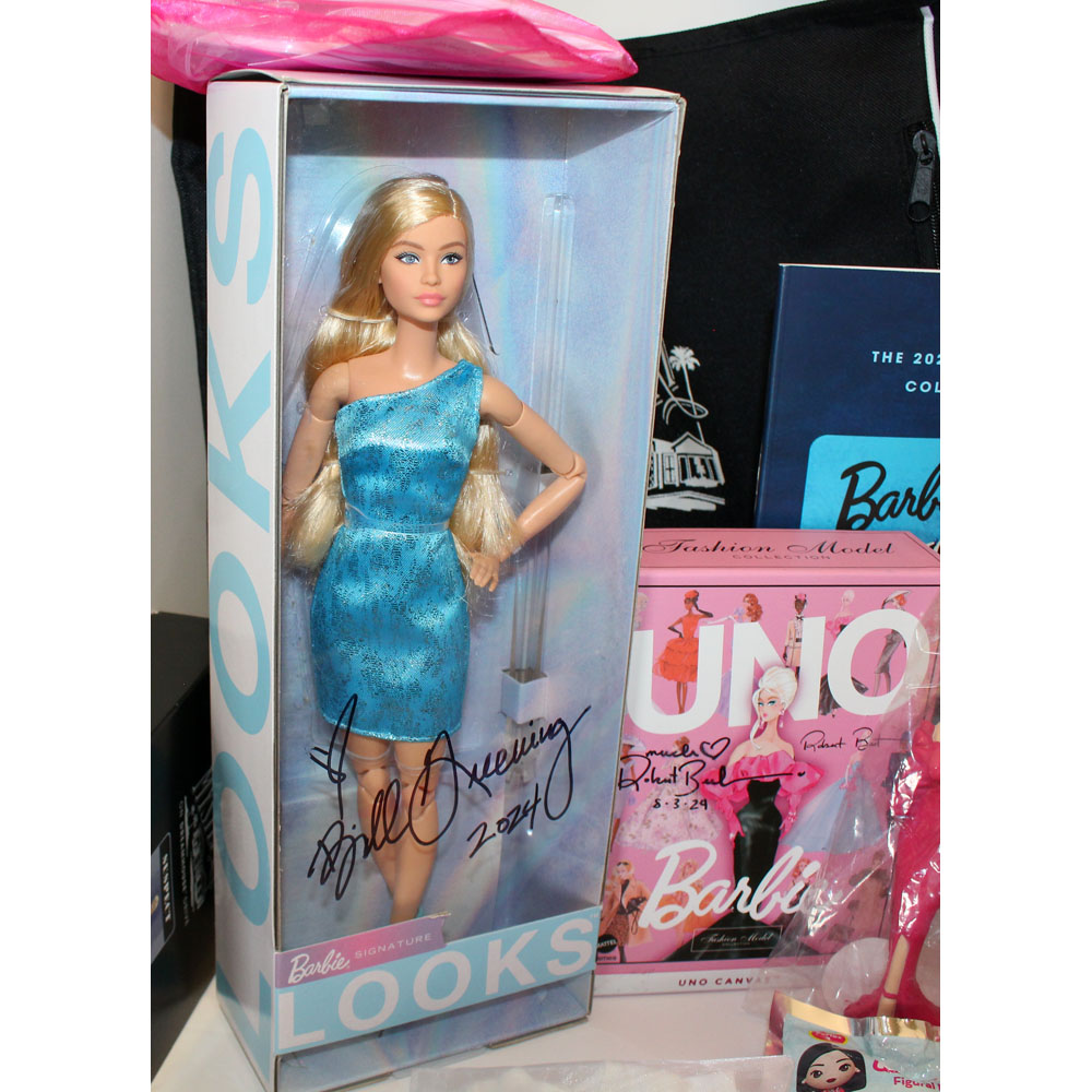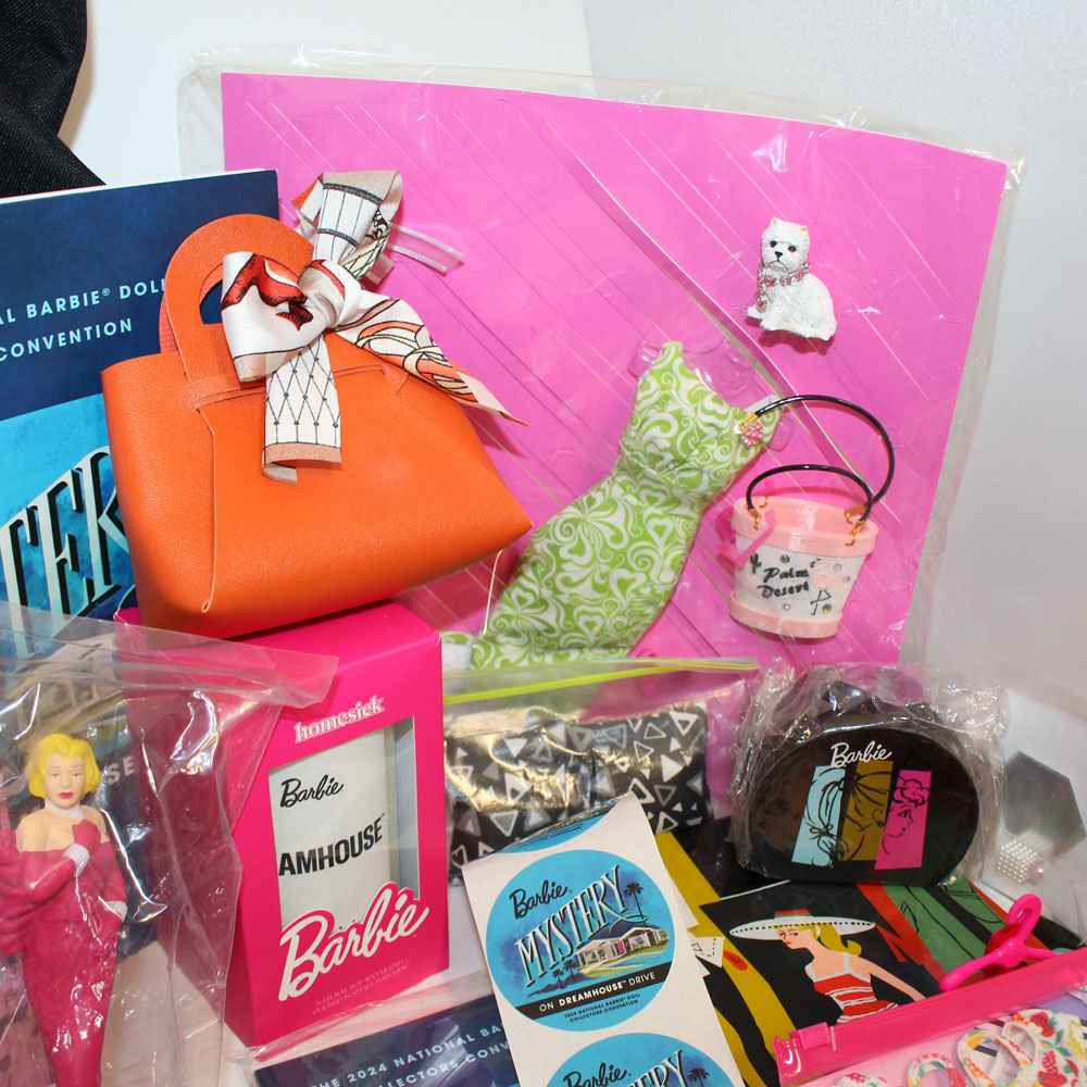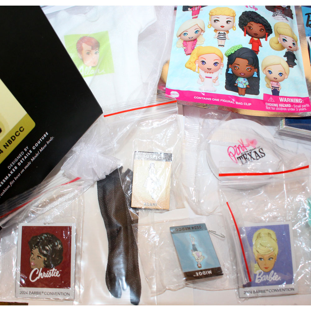 This set includes: Black Convention bag, a Barbie picture, 2 pillows, 4 pins, Barbie Dreamhouse candle, Green & white Barbie fashion (dress, hat, shoes, dog, bag), Barbie Look doll signed by Bill Greening, 4 Dressmaker Details Couture outfits, UNO Barbie signed by Robert Best, Barbie notebook, postcards, white shirt for Ken and black shoes, Barbie bag clip and lots of little accessories. The little accessories will vary in each set. One set will include the Blonde Barbie Look doll and the other set includes the Brunette.