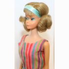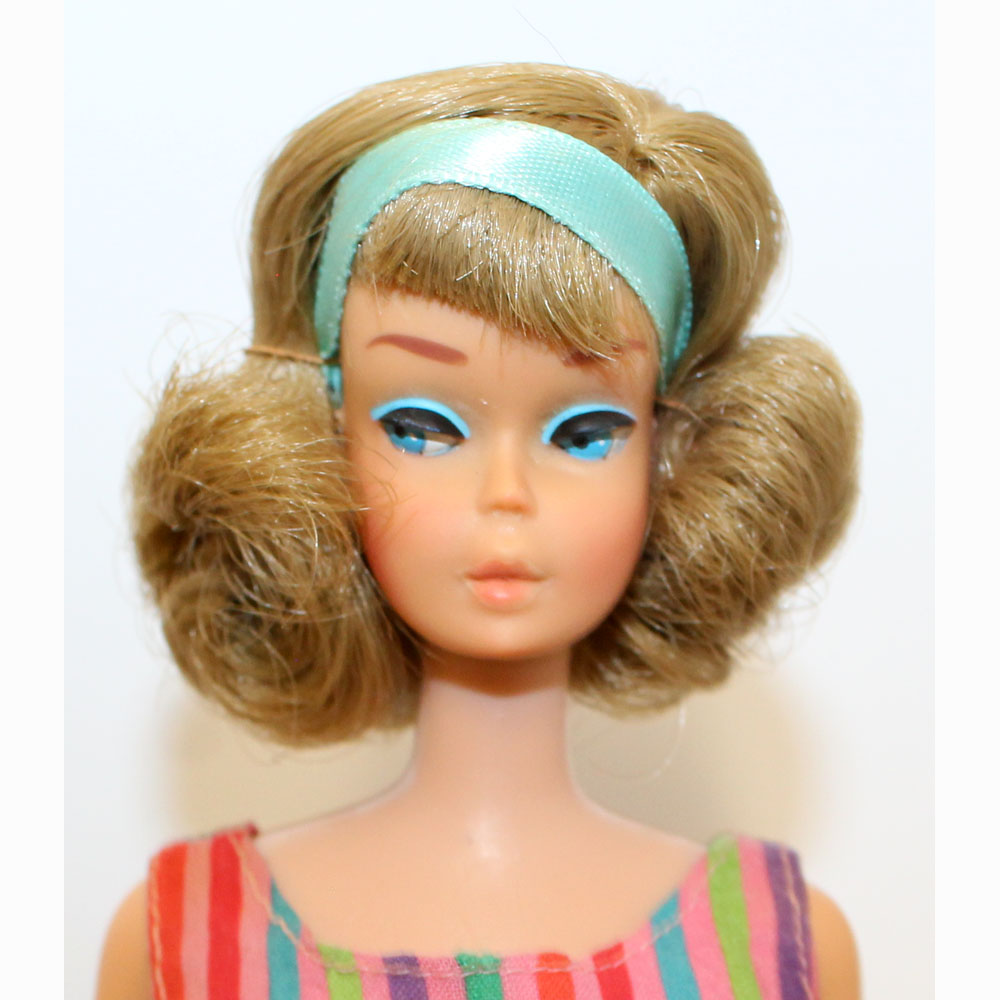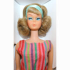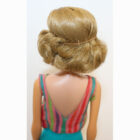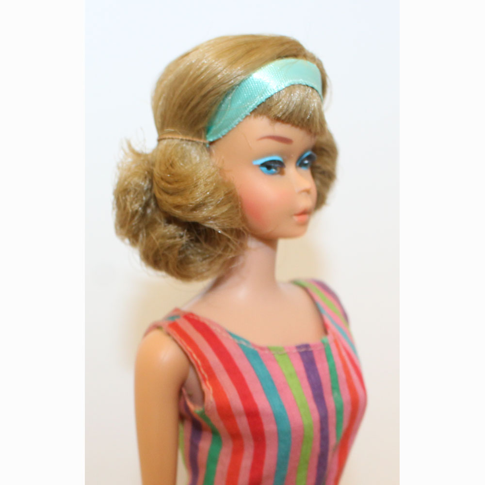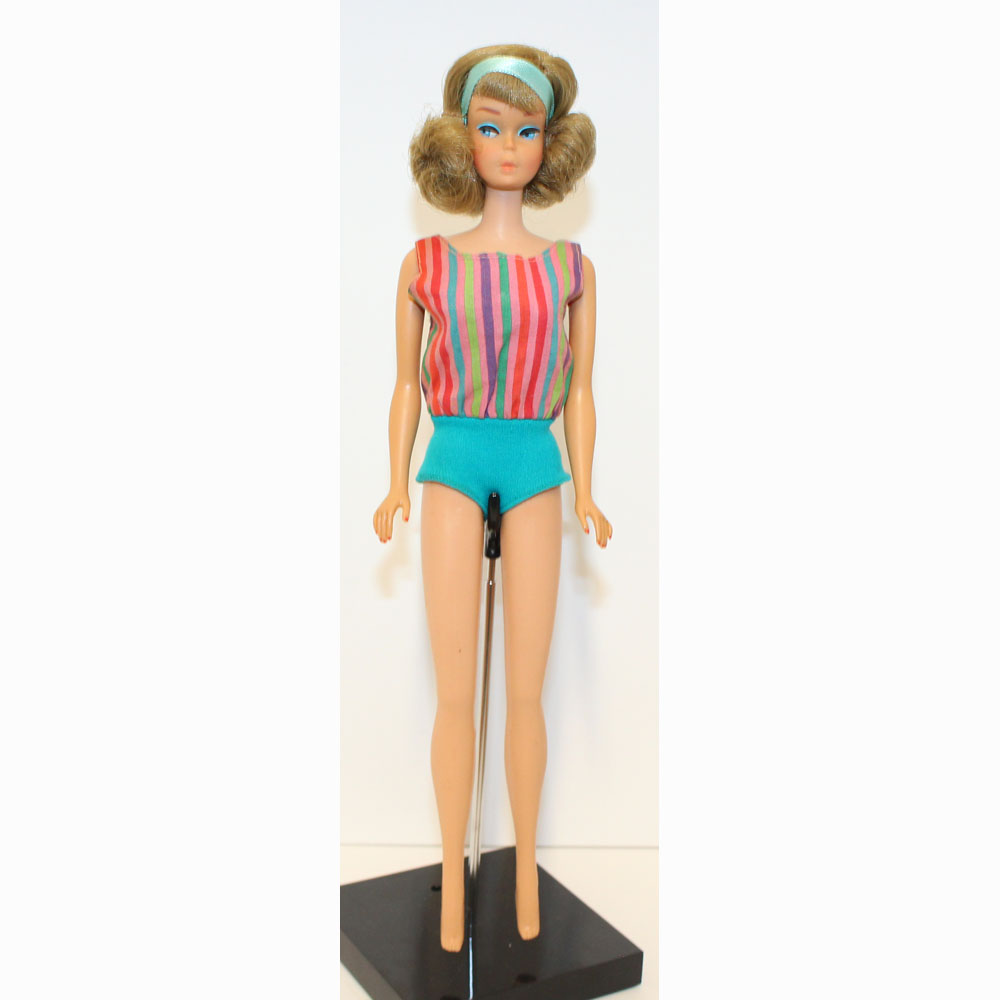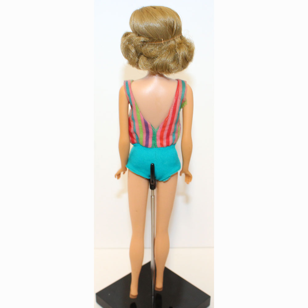This is a Vintage Silver Ash Blonde American Girl Side Part. She has her original fingernail polish. She comes in her original swimsuit, which is in great condition. Her hair is in the original set. She has nice long bangs and very full thick hair all over.ย  Her face paint is all original, just stunning! She has nice full eyebrows, no fading. She has light blue eyeliner. Her cheeks are nice and rosy on both sides of her face. Her lip color is original and coral.ย  Her body has nice tight limbs. Her legs are nicely spaced. No neck splits, green ear or earring taps. Thighs are tight and knees bend. She’s just stunning and awesome! NM/Mint.