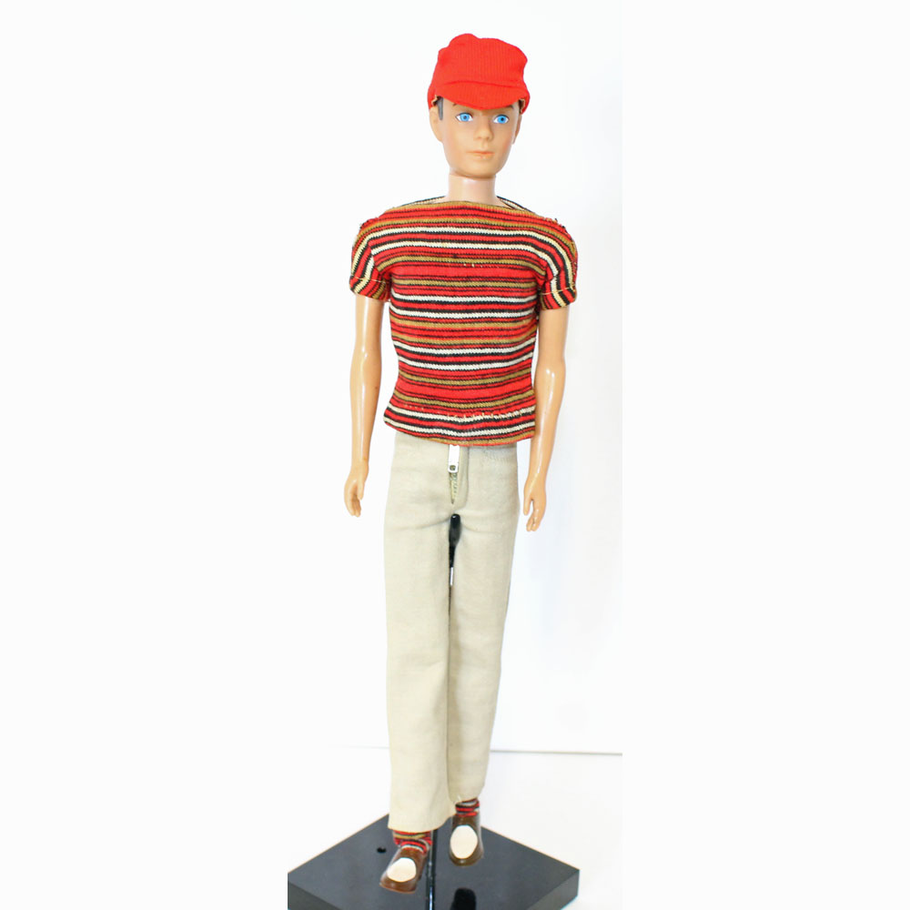 Two Blonde painted Ken dolls an one Brunette painted Ken doll. One brunette flocked doll and a re-flocked red hair doll. EC/NM fashions on GC/EC Ken dolls. One of the arms on the brunette painted hair doll is loose. Outfits are not complete.