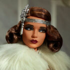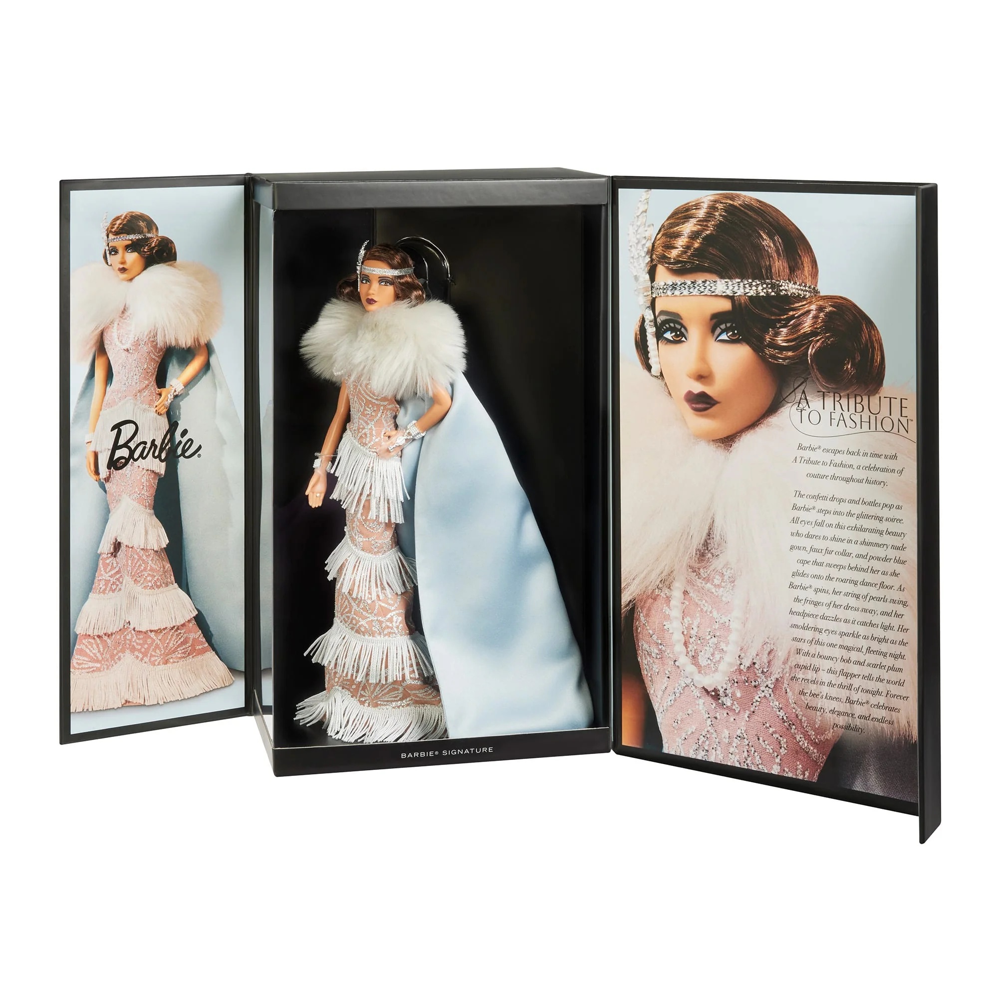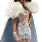 For the second entry in our history-inspired fantasy series, Barbie celebrates the Roaring Twenties in luxurious flapper-inspired couture. The shimmery nude gown drips with fringe details that sway with her every dance move. Heads will turn at the dramatic sweep of her powder-blue cape, which adds even more elegance to this elevated Art Deco look. Accessorized with a draping โpearlโ necklace and matching headpiece, our premium doll will razzle-dazzle collectors and fashion fans alike.