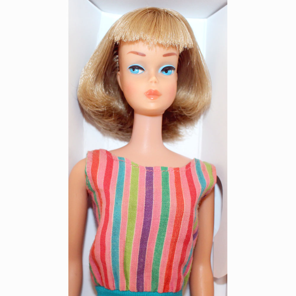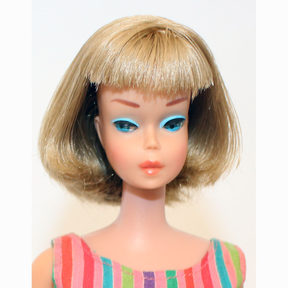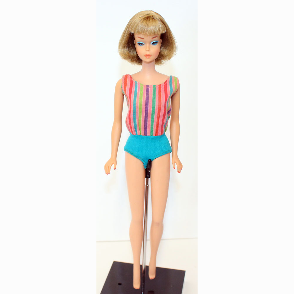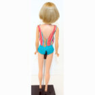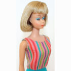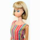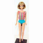 This is a Vintage Ash Blonde American. She has all of her nail polish. She comes in her original NM/M swimsuit, which is in great condition. Her hair is in the original set. She has nice long bangs and very full thick long hair all over. Her face paint is all original, just stunning! She has nice full eyebrows, no fading. She has light blue eyeliner. Her cheeks are nice and rosy on both sides of her face. Her lip color is original and coral. Her body has nice tight limbs. Her legs are nicely spaced. No neck splits, or green ear just two discreet earring unnoticeable taps. Thighs are tight and knees bend. She’s just stunning and awesome! NM/Mint.
