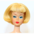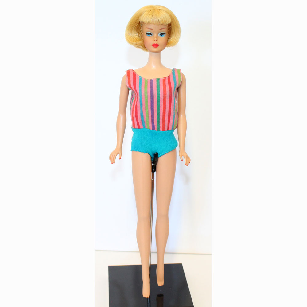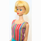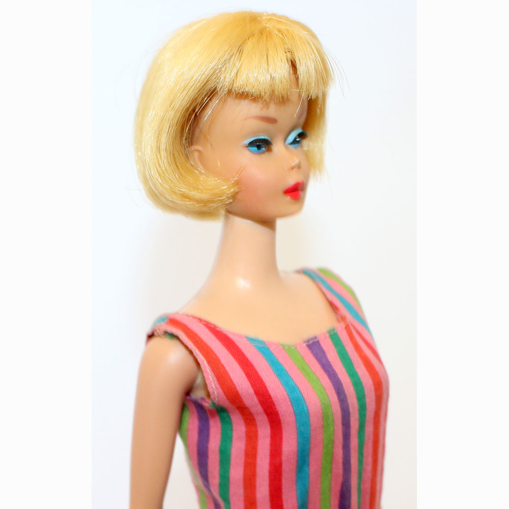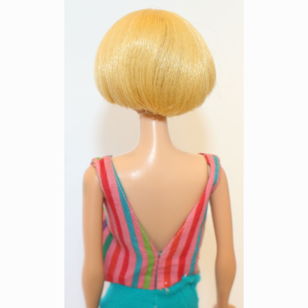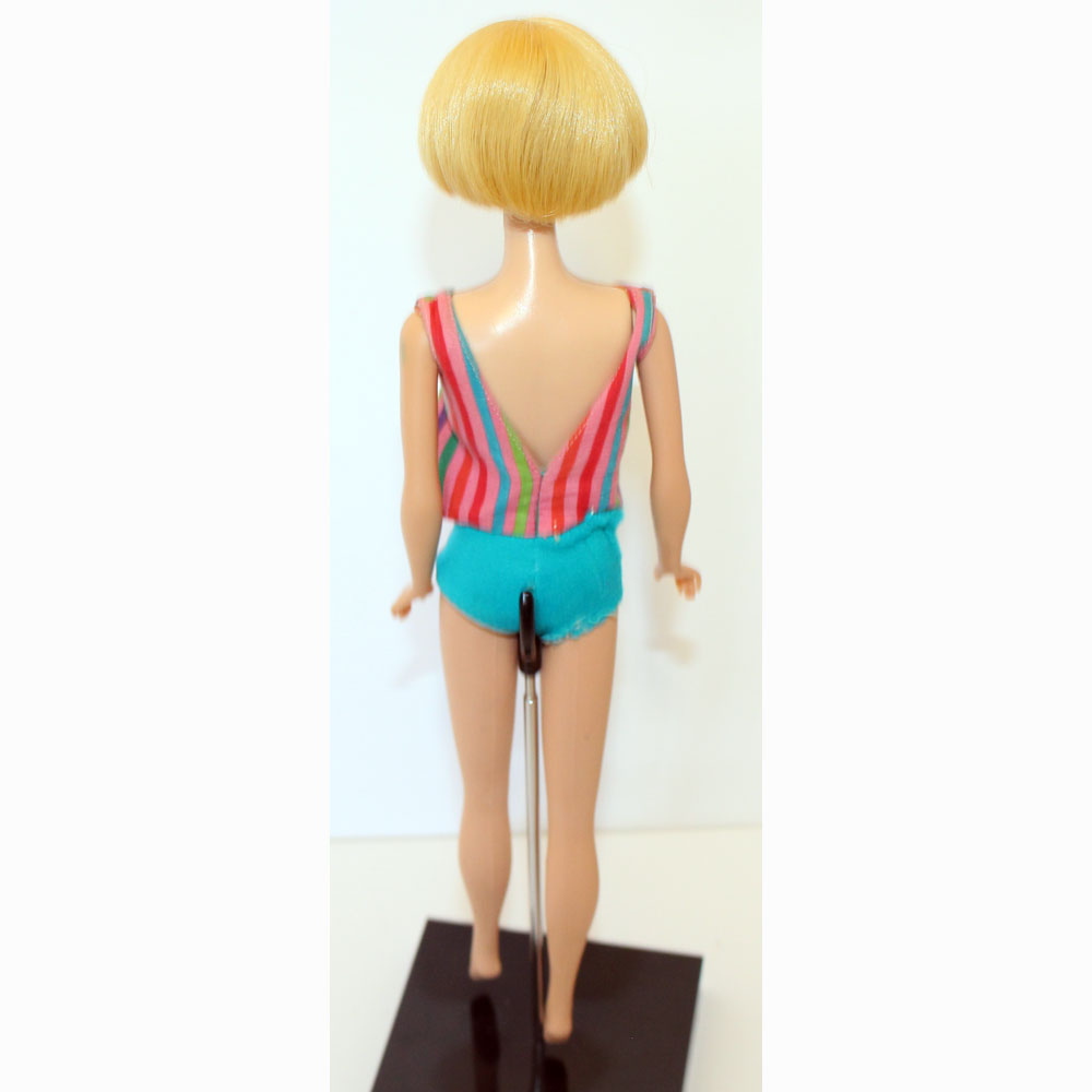 High color blonde American Girl. Her body is nice with no pin pricks, and all fingernail polish. She does not have her toe nail polish. Her hair is the shorter version from 1965 and is very thick. There are no green ears or green anywhere on this doll. She has her original FC/EC swimsuit. No chews or neck splits, and no taps at ears. Thighs are tight and knees click. So pretty!