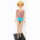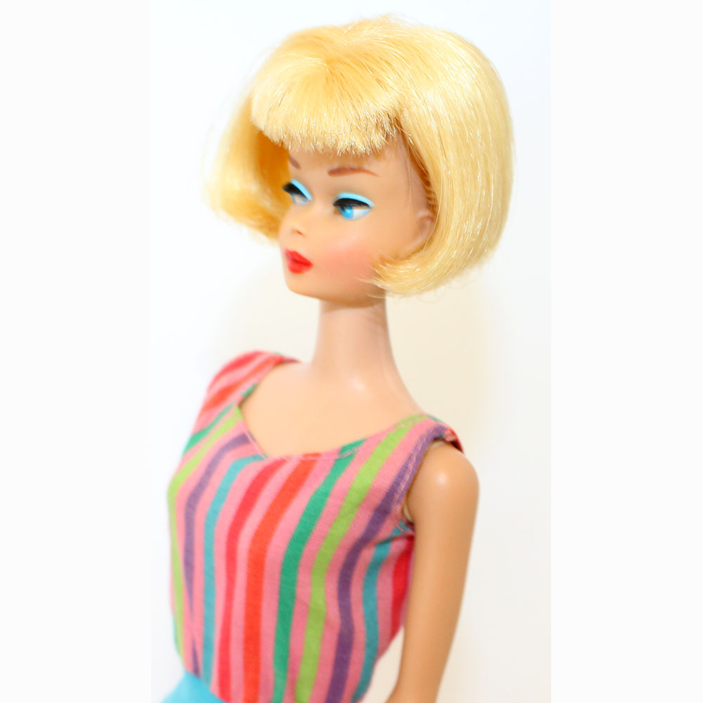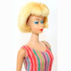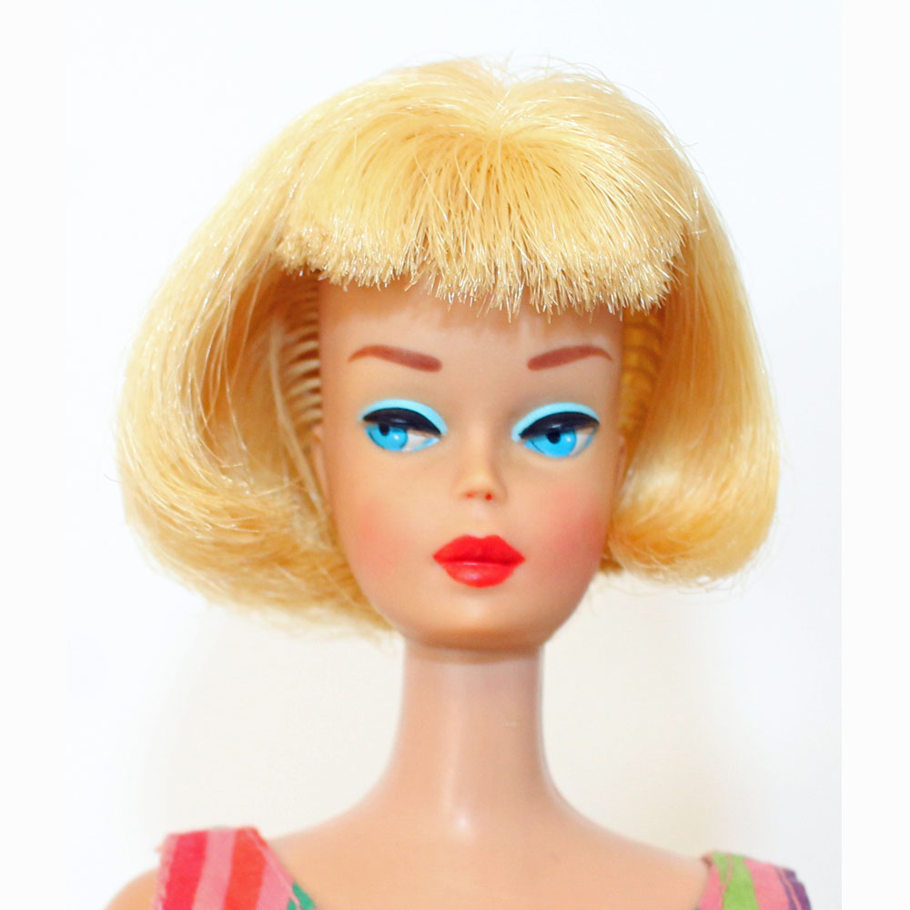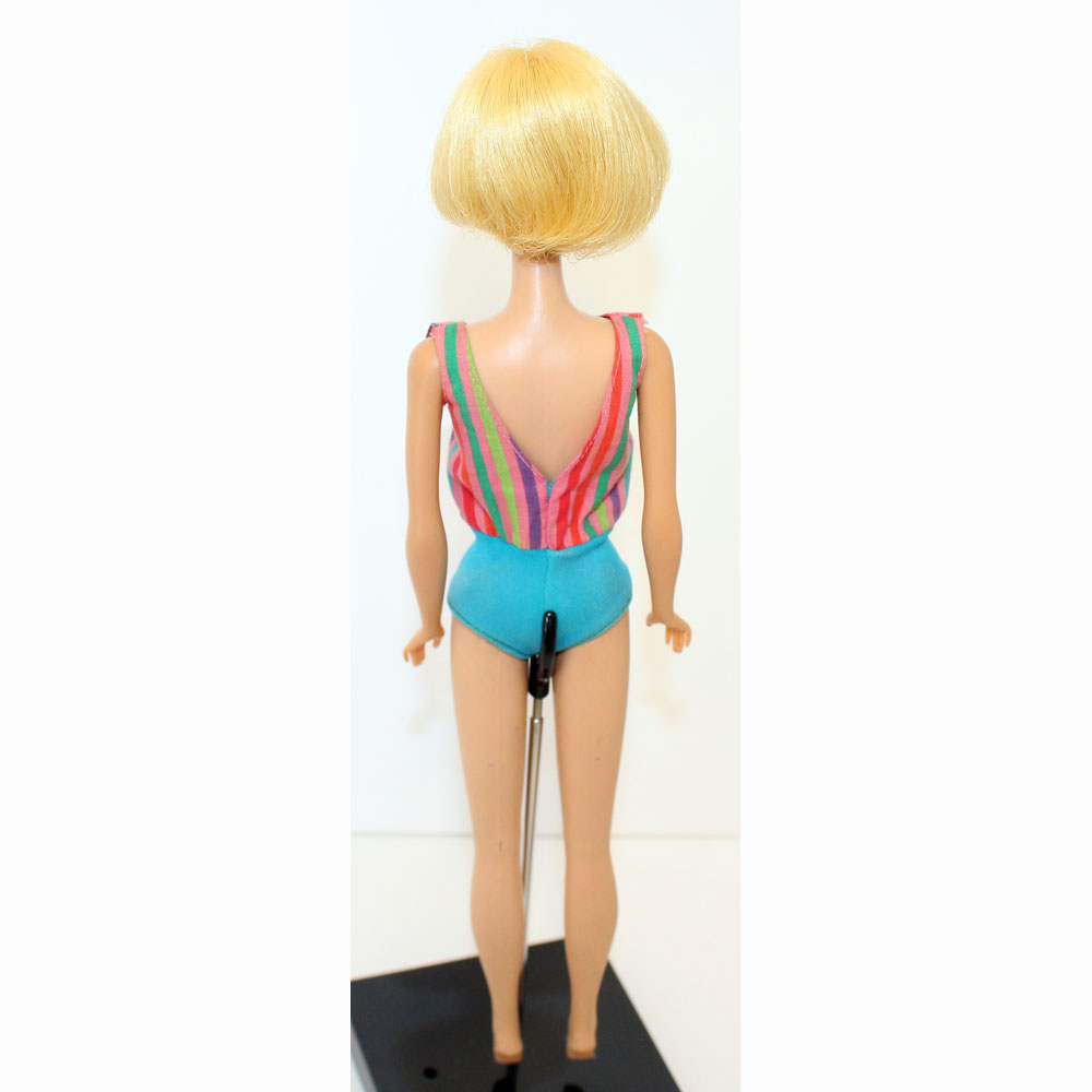 American Girl: Blonde. Her body is nice with no pin pricks, and all fingernail polish. Her hair is the shorter version from 1965 and is very thick with maybe a double row of bangs. There are no green ears or green anywhere on this doll. She has her original EC swimsuit. No chews or neck splits and no taps at ears. Thighs are tight and knees click. Lovely addition for a new fashion! NM.