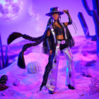 The Barbie Fashion Frontier series features out-of-this-world looks that blend Wild West and space-chic for a totally fresh feel. The second doll in the series shines in a night-sky inspired look, with a black crop tank, shimmering fringed cape, and matching silver starburst-patterned chaps. She elevates the celestial style with a rhinestone-buckle belt, leather arm cuffs, and a wide-brimmed hat that instantly rocket her to star status.
