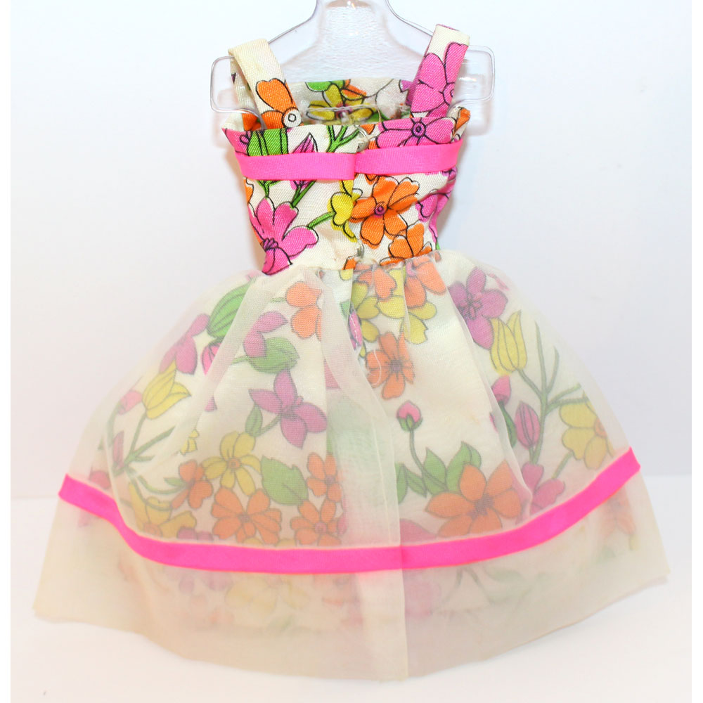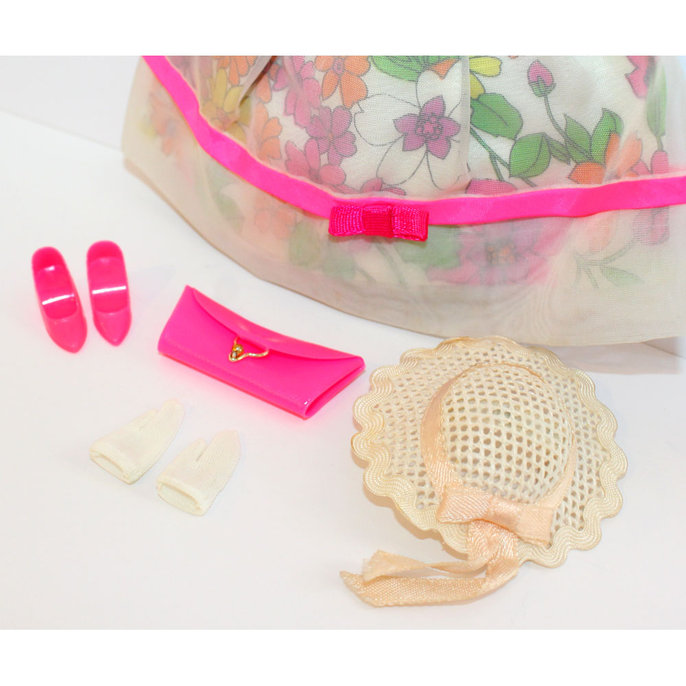 Includes flowered dress, hot pink closed toe heels, pink envelope purse, white gloves and off white hat. C/NM/M.