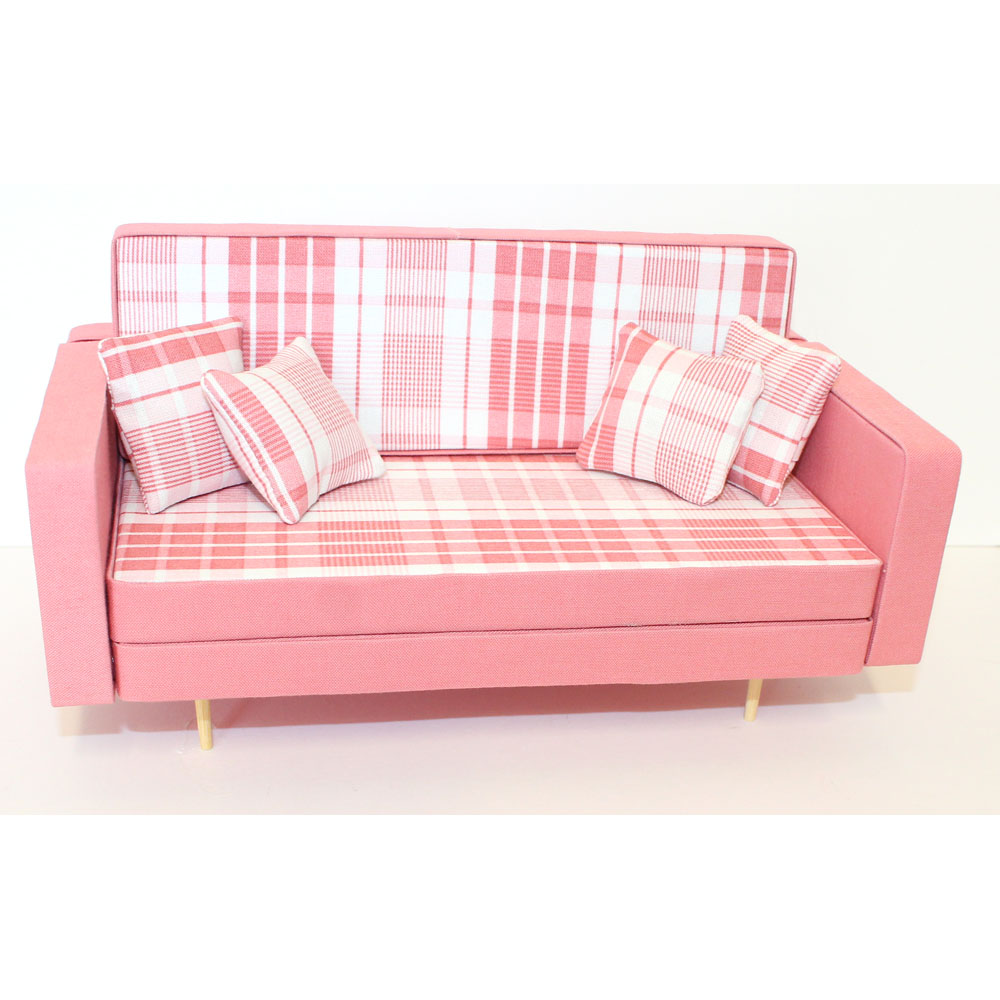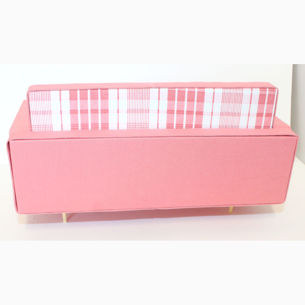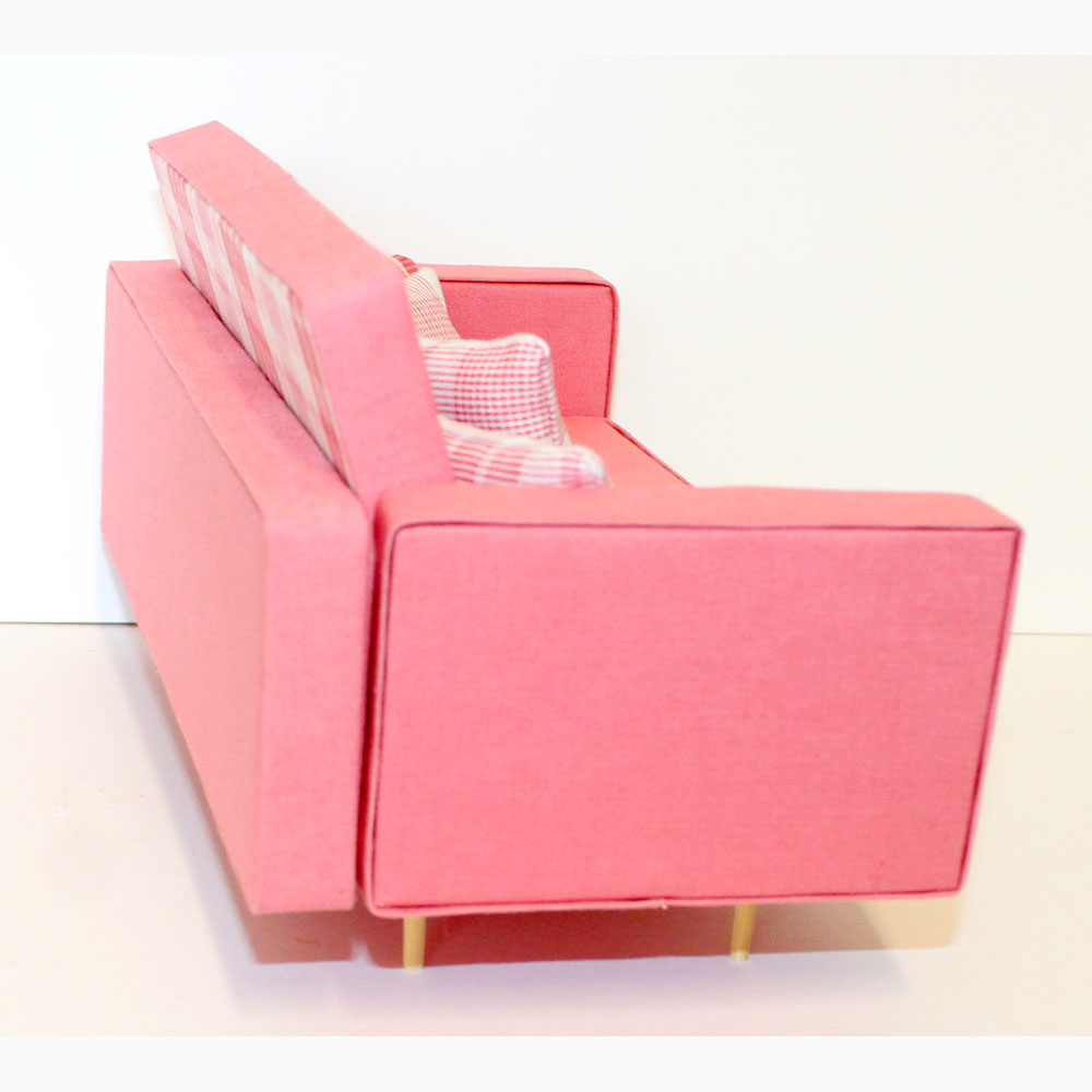 Beautifully made Barbie sofa with 4 pink and white pillows. 1/6ย scale, handmade & 3D printed furniture. Very mid-century! The “cushions” are reversable. DOLL NOT INCLUDED.