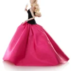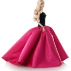 Beautiful strapless gown with black trimmed bodice attached to a voluminous magenta skirt with removable floral appliquรฉ belt;