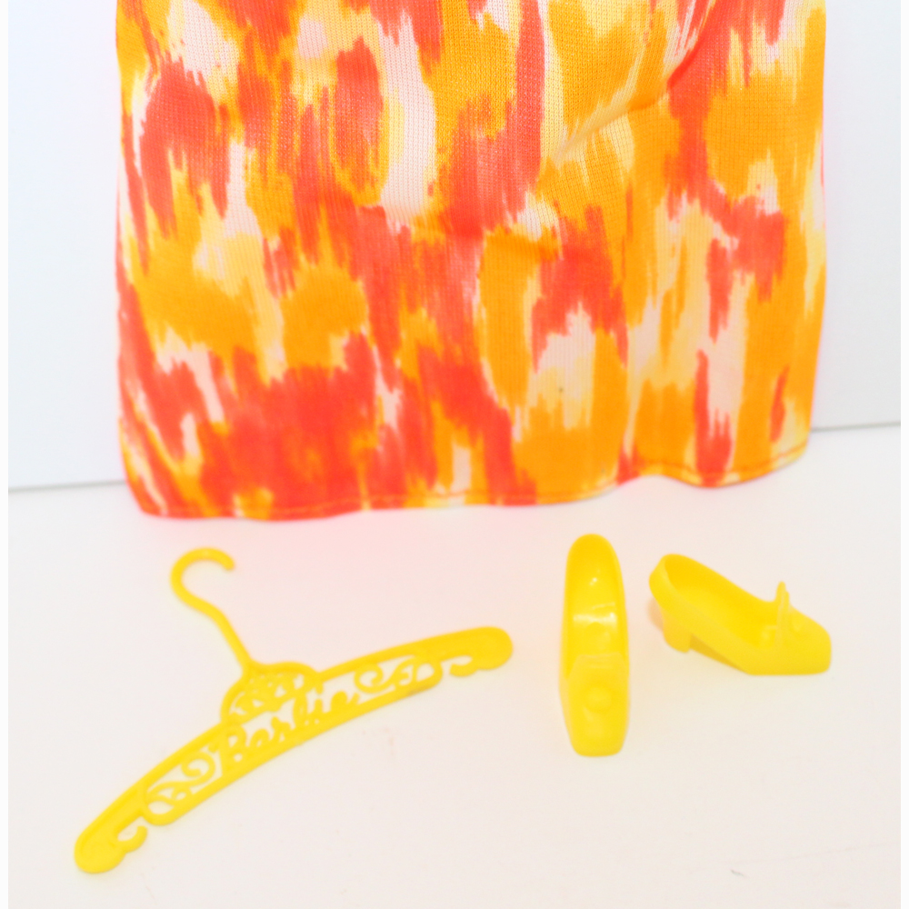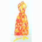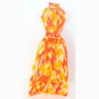 Vintage halter dress in yellow and orange print dress. Comes with yellow pilgrims and hanger. NM/M.