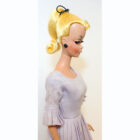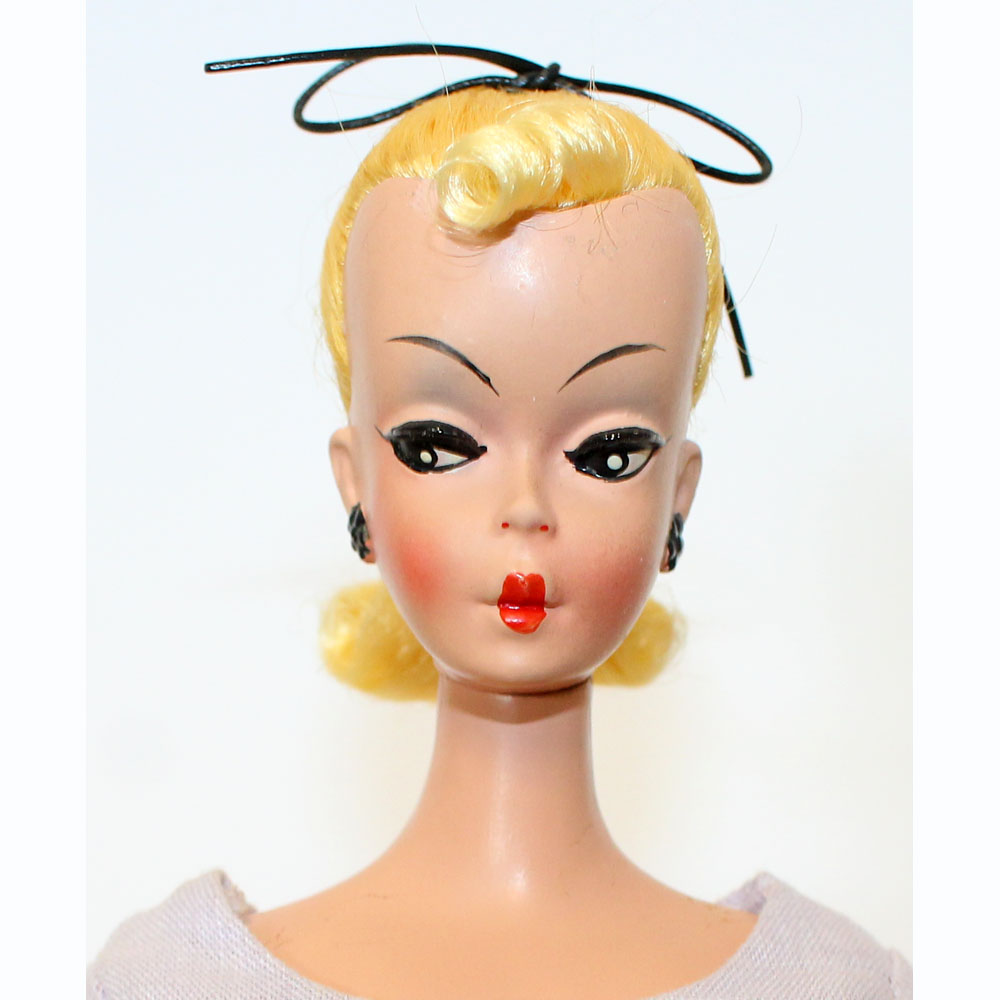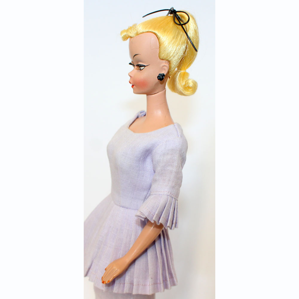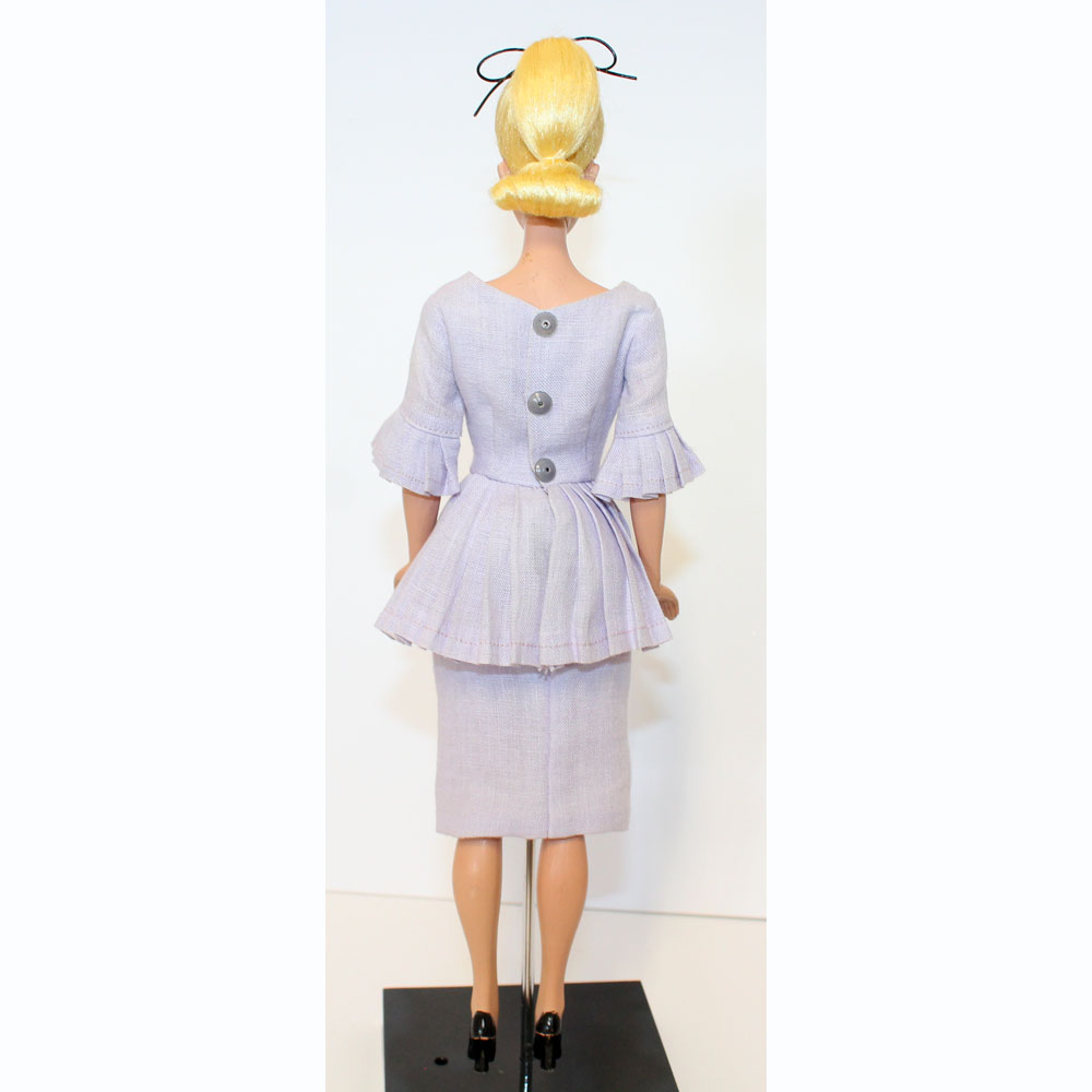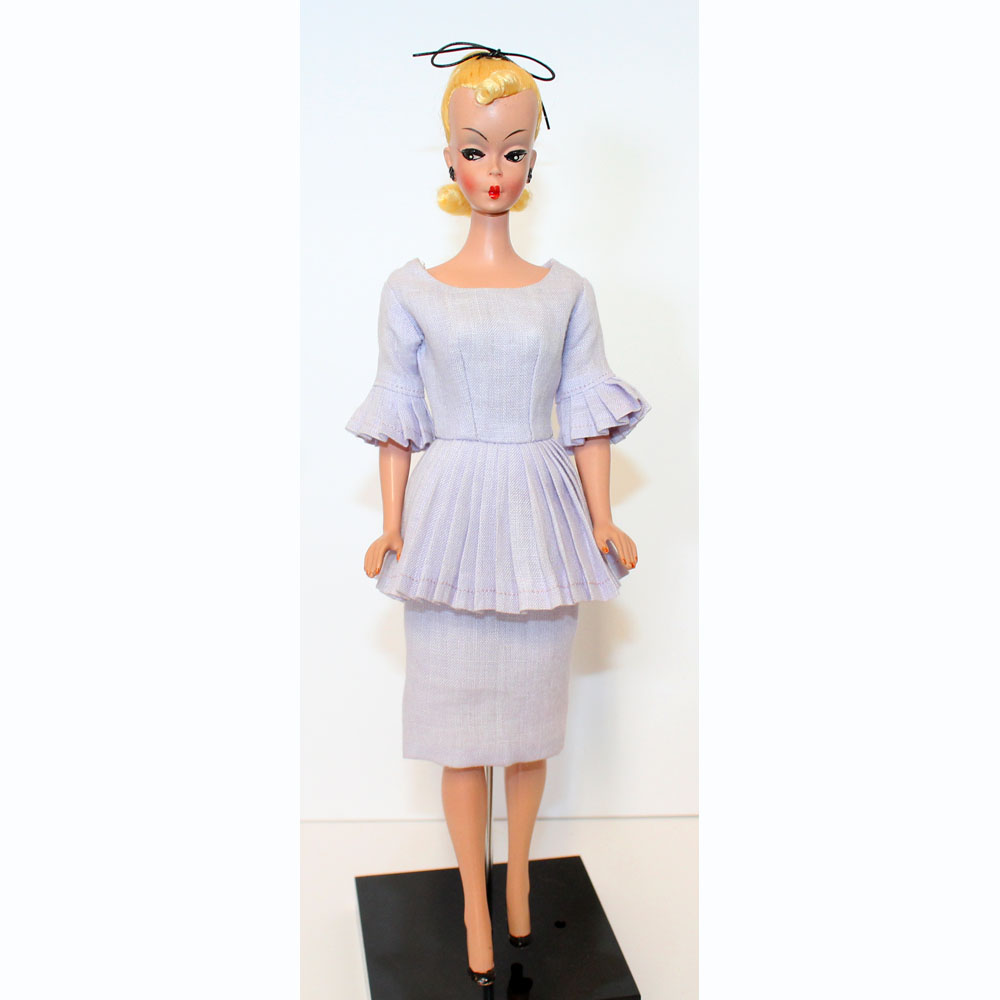 Original lilac pleated cocktail dress with peplum. No stock number. On Page 154 in the “Silke Knaak” Book.ย  She’s a ray of sunshine with her black bow in her hair. Doll and fashion are NM/Mint.