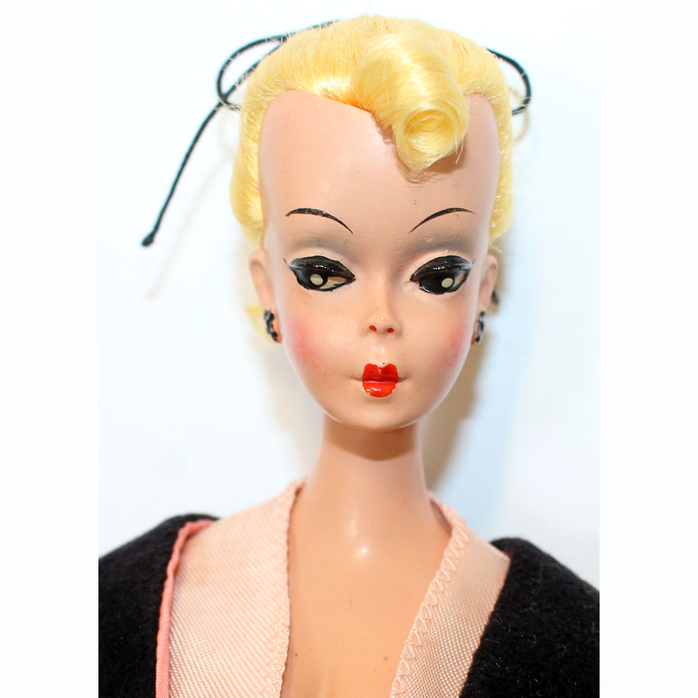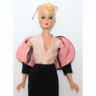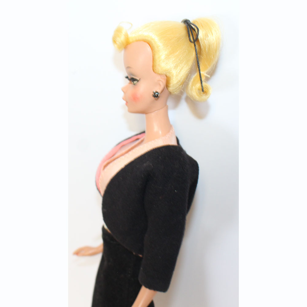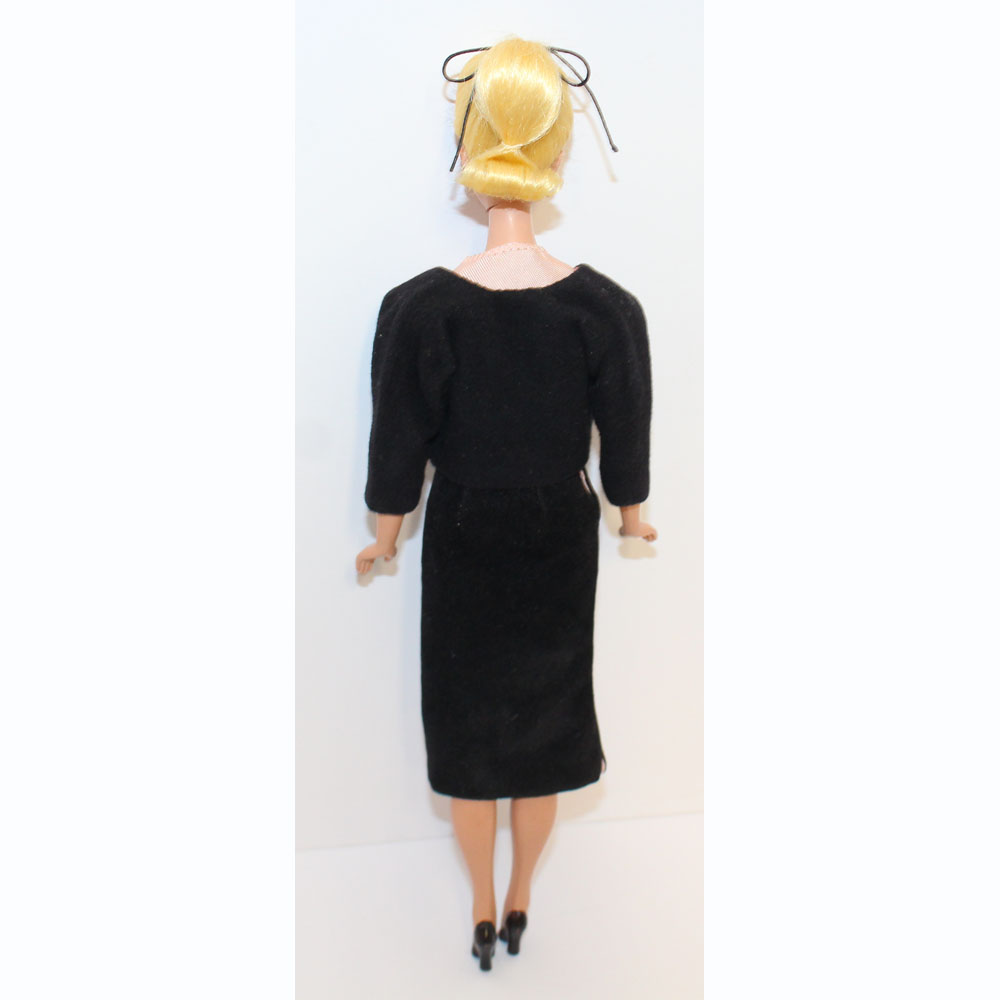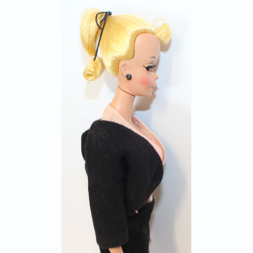 Blonde Bild Lilli in a gorgeous black velvet suit with pink short sleeved blouse #1138. Look for her on page 98 in the Silk Knaack book. Her hair has the black bow and body is perfect for her age. What a beauty! NM/M.