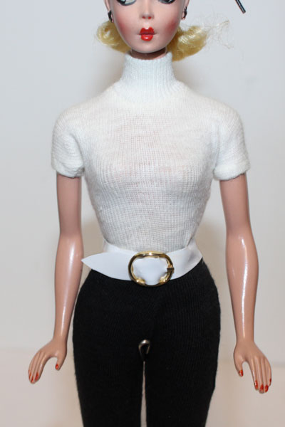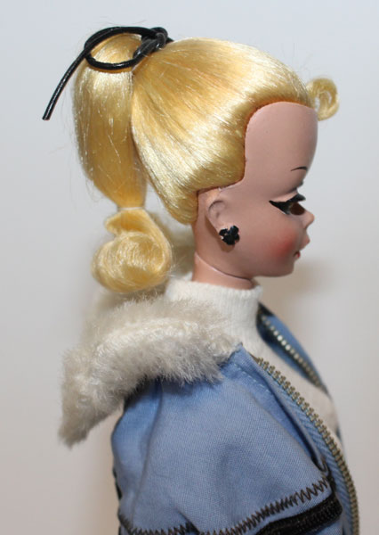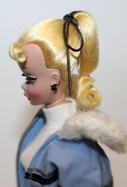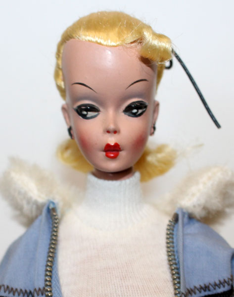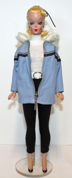 A beautiful blonde Bild Lilli dressed in an original Blue Poplin Anorak jacket with long sleeves #1129. There’s a black trim around the jacket and a white plush collar. Black slim pants #1117 and a white short sleeved cotton shirt complete this authentic outfit. There is a white plastic belt with silver buckle, but not sure it is Lilli. Everything is lovely and NM/Mint.