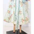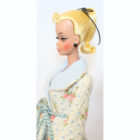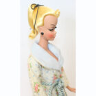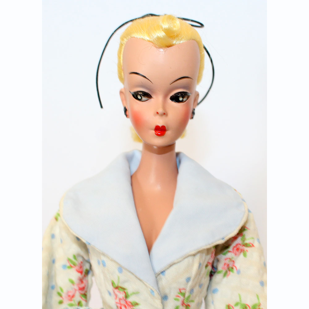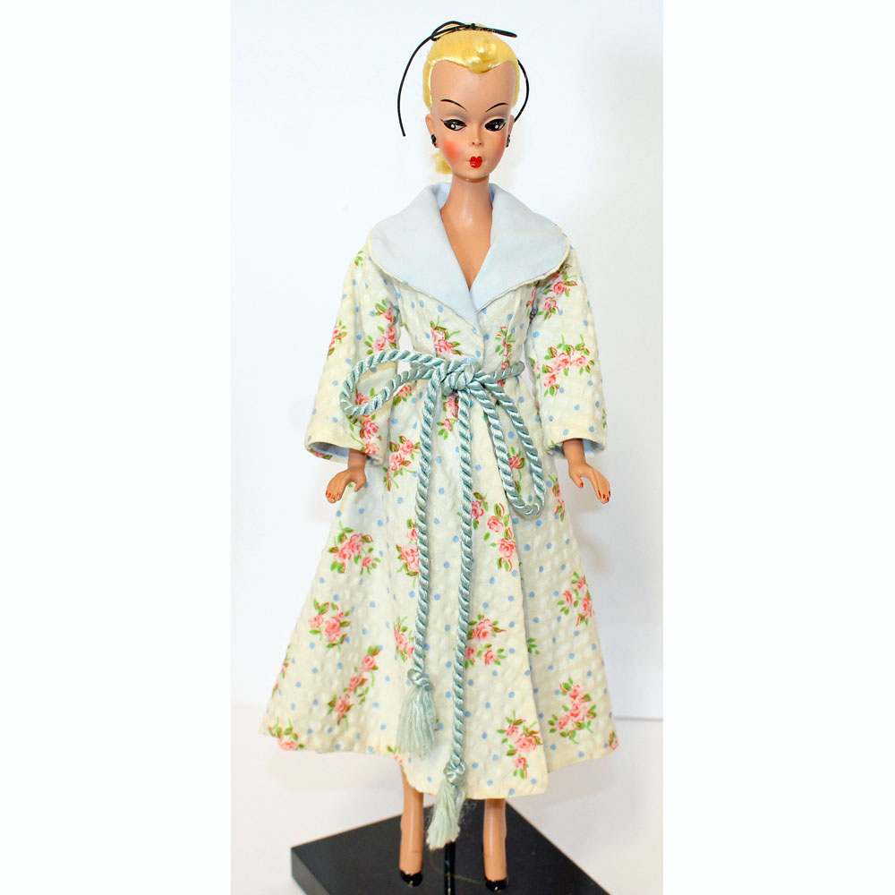 She’s wearing a #1162 flowered white and powderย blue dressing gown that comes with original blue and white tie belt with tasseled ends. This is VHTF on the waist and has a powder blue lining that shows on the collar, so fabulous!ย This is pictured in other designs on pg 120 in the Silke Knaak book. NM/M.