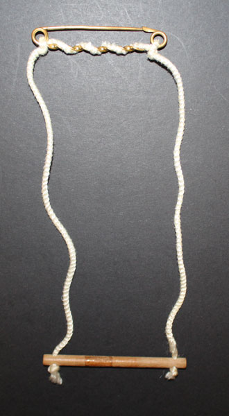 Here is a must to complete your German Bild Lilli doll! It is her rare hard to find original swing that came with the doll. It has a brass scottish skirt type safety pin at the top with a brass twisted bar, that has the cord rope wrapped around it. At the end of the 2 cord ropes is a wooden bar that Lilli would have sat on to swing. It measures 11″ long by 3″ wide. A MUST HAVE for the vintage Barbie, Bild Lilli collector!! A RARE Accessory!!