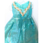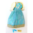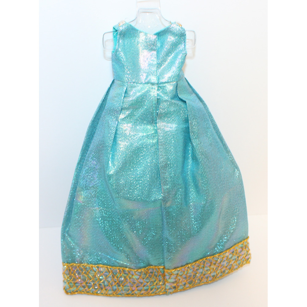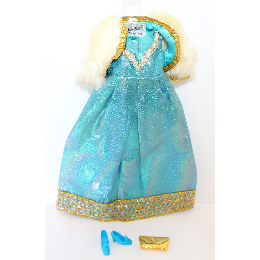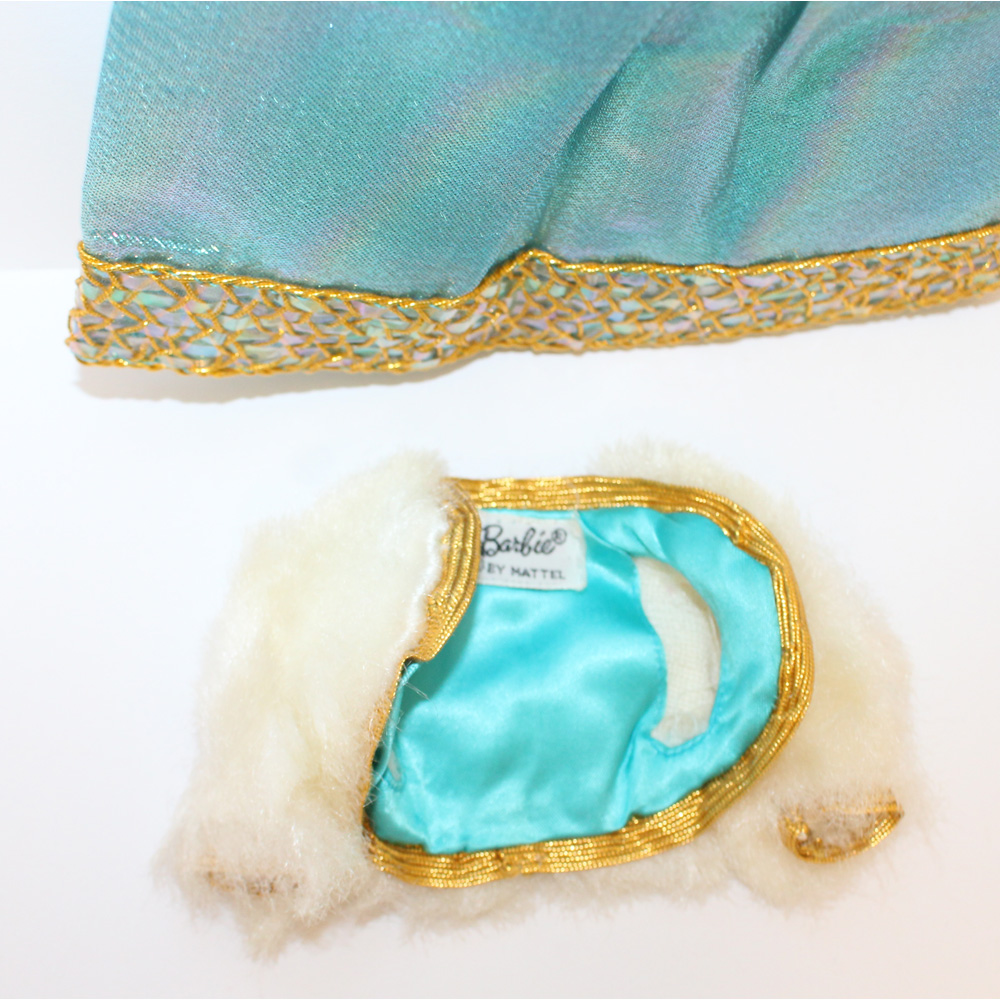 Turquoise blue lame gown with silver and gold metallic trim, white fur jacket, and pilgrims. C/EC/NM.