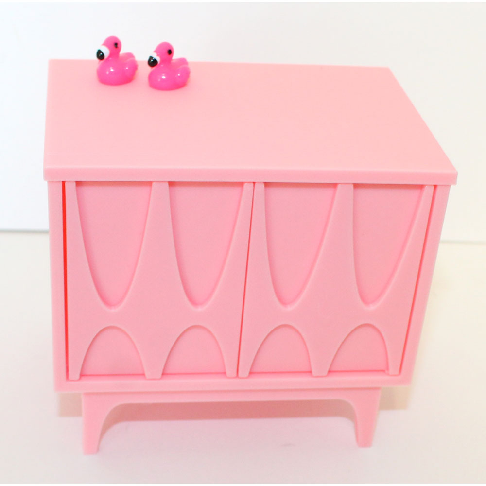 Beautifully made! 1/6ย scale, handmade & 3D printed furniture. Very mid-century! The cabinets open. It comes with all accessories shown.
