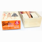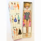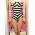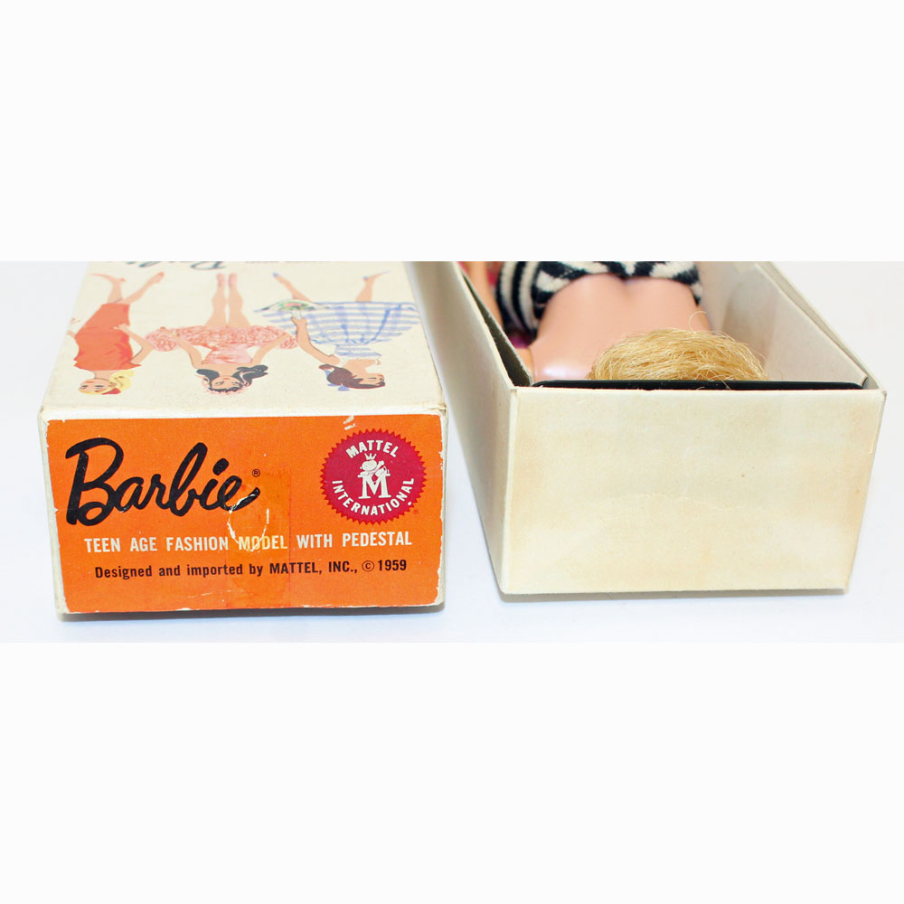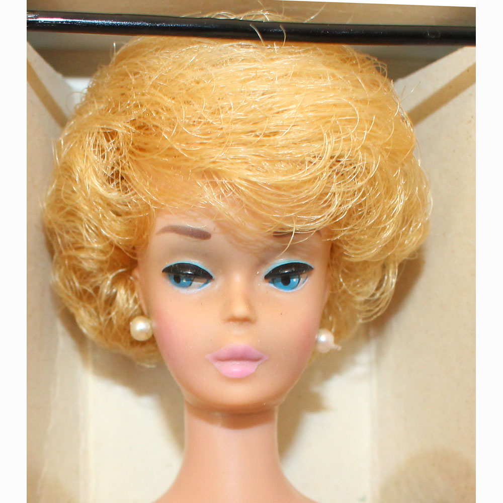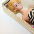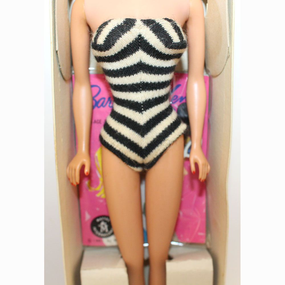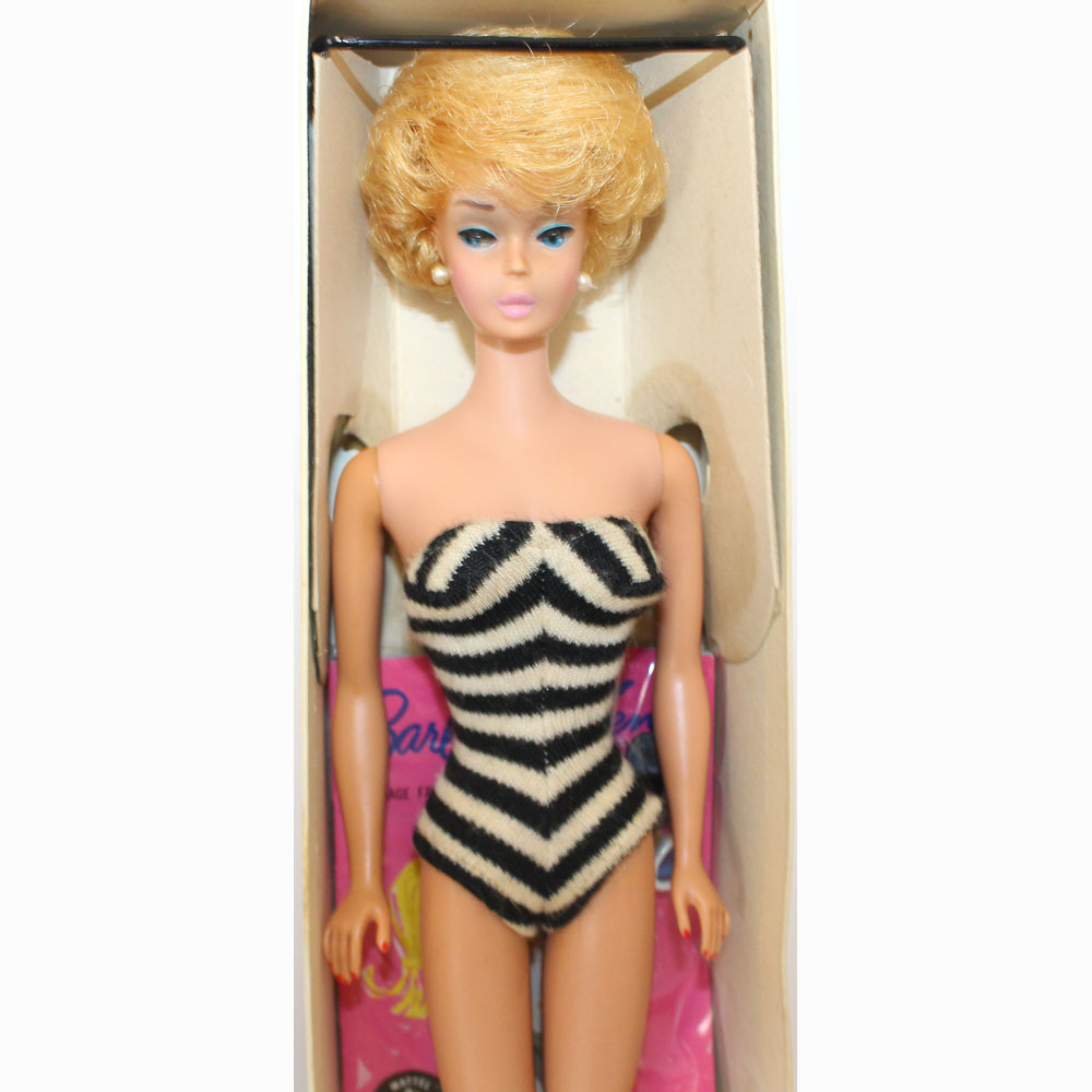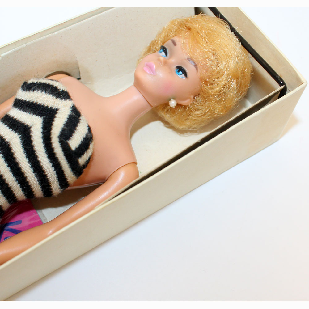 This is a Bubble Cut Barbie doll with lovely white ginger hair and gorgeous makeup from 1961. She has those original bubble gum pink lips on a #5 Barbie body. She has all of her red fingernail polish and toe polish. Nice semi dark eyebrows. She wears an original zebra swimsuit. No chews or pin pricks. Her hair is extremely beautiful! No green or neck splits. She has her White Ginger box in NM/M condition, stand, booklet, shoes and sunglasses and all in original liner. Doesn’t get any better then this ever! MIB.