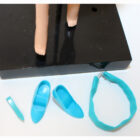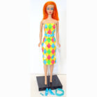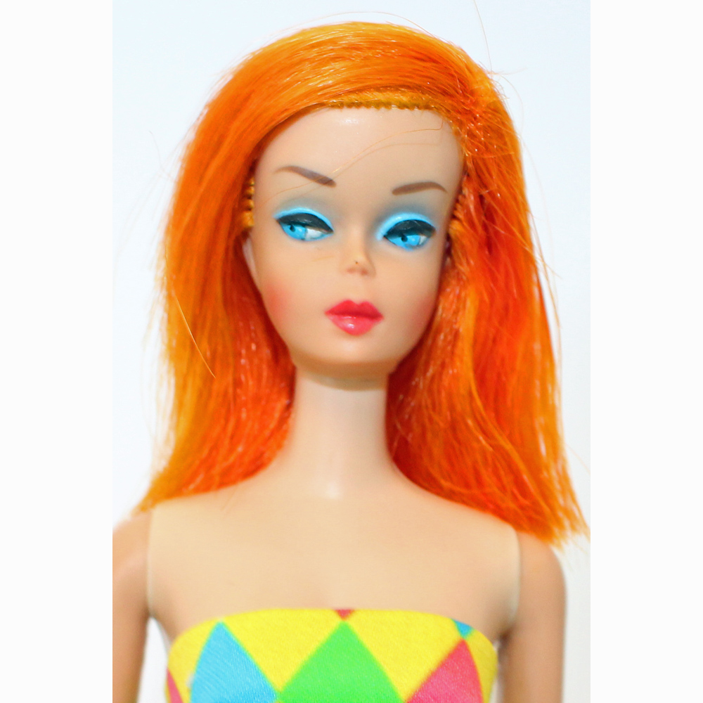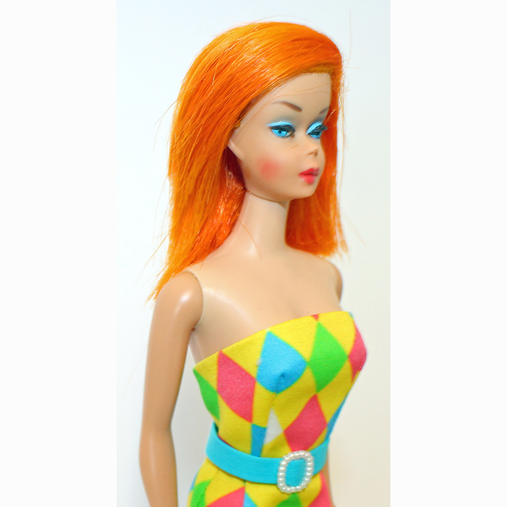 This is a Hi Color Bright Ruby Red Flame Color Magic. She is dressed in an exclusive LINDA DEMBEK color Magic sheath with belt and turquoise closed toe shoes and turquoise barrette. She has original geranium lips with rosy cheeks. Thighs are tight and knees click. Some finger polish. No pin prinks, chews, neck splits or green. She’s gorgeous and her hair is beautiful and thick and long. Amazing face and bright fame red hair! Mint.