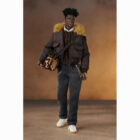Textural knit sweater;ย Flight jacket with “fur” collar;ย Removable belt;