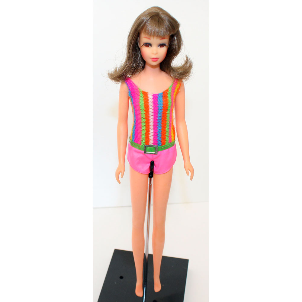 Stunning Vintage Blonde short haired Flip Twist ‘N Turn TNT Francie doll. Her hair is thick and in it’s original set from the factory.ย No hair cuts or missing hair plugs.ย She has all of her lashes and they are straight, thick and full. Her makeup is terrific with bright pinky/coral lips and rosy cheeks. There are NO earring holes, fades or splits. Her body is mint too, as there are no stains or knicks.ย She is dressed in her original pink and yellow swimsuit and has her repro yellow hairband. Mint.