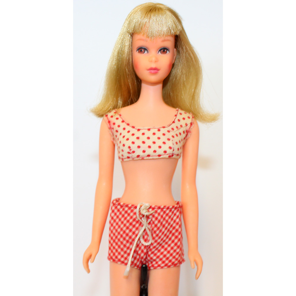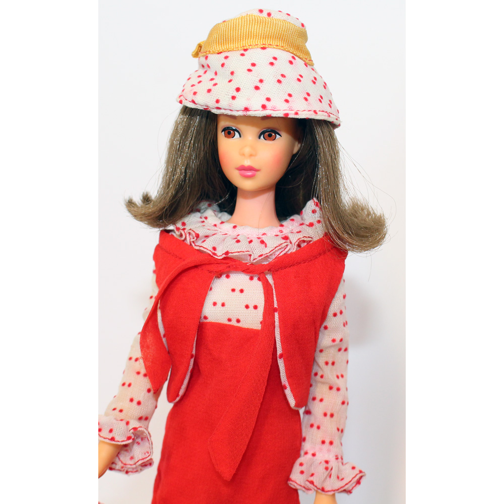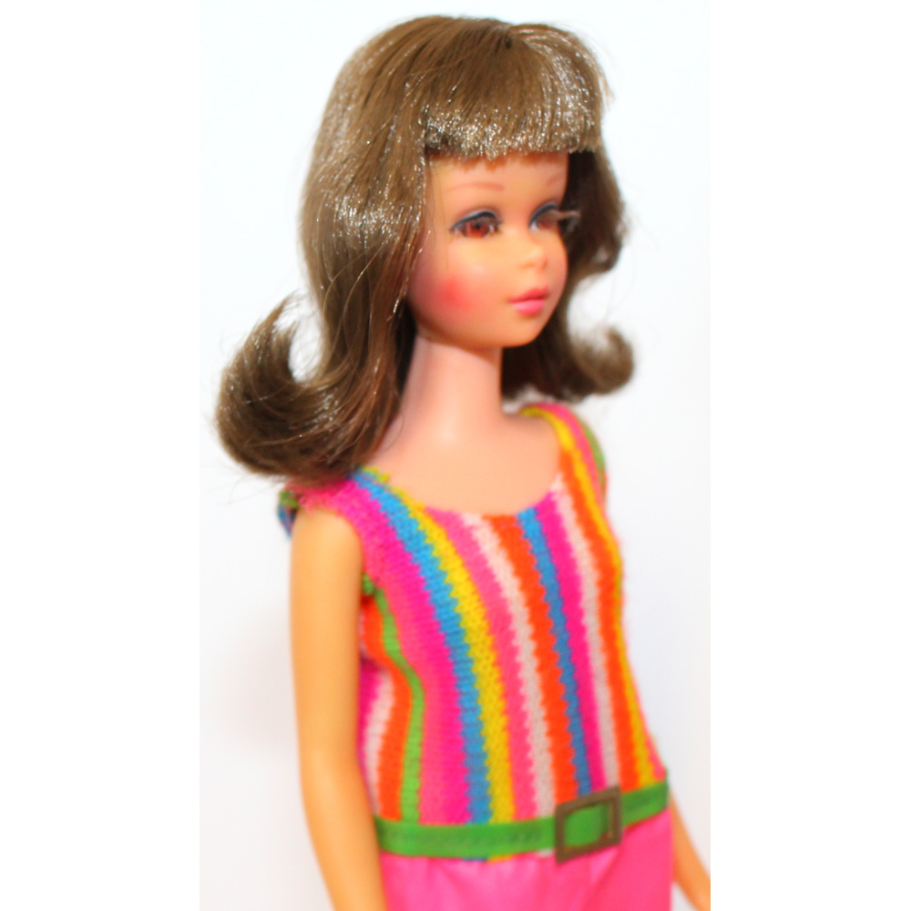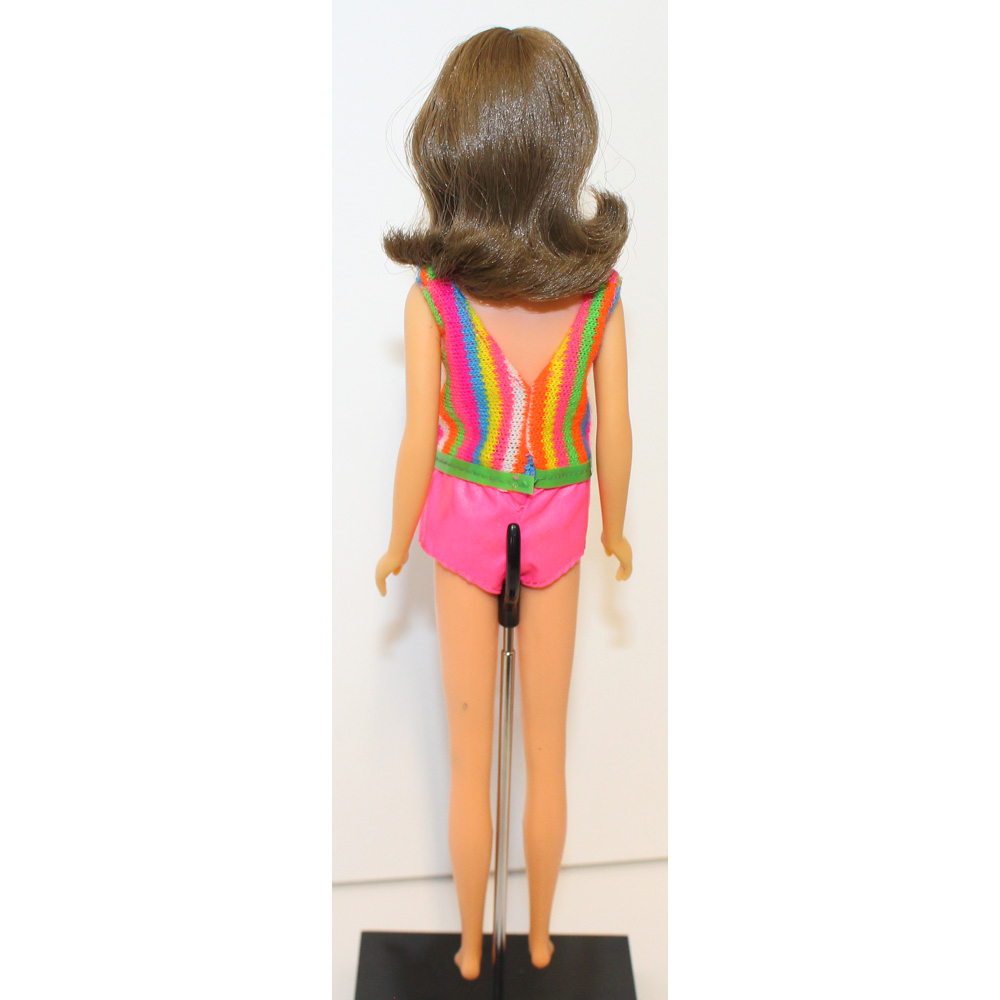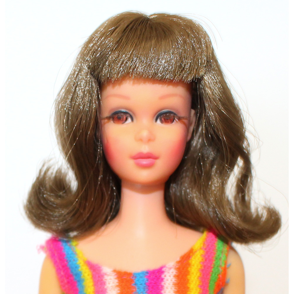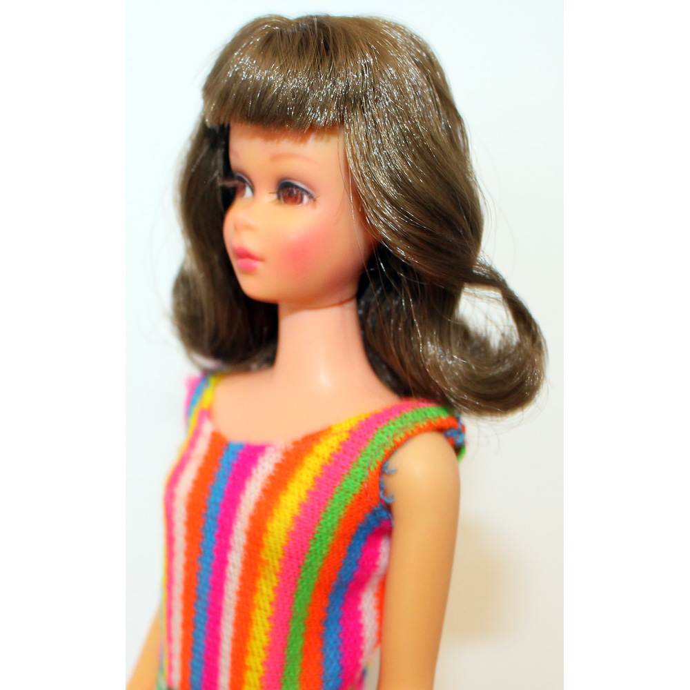 This is a Brunette TNT Francie Doll. Her hair is nicely curled, thick and long and has not been cut. There are no missing hair plugs. Body is nice with no pin pricks, green, chews, neck splits or earring taps. Her makeup is original and she has rosy cheeks. Eyelashes are good and thick. No fades. Her thighs are tight and her knees click. She is wearing her original swimsuit in NM condition. NM/M.