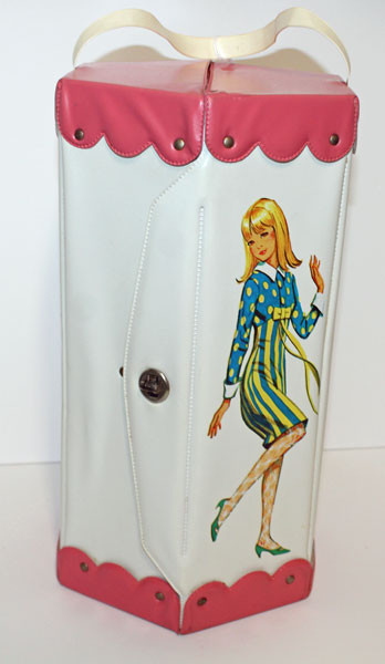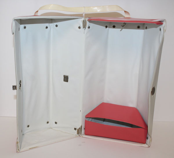 Francie Hexagon pink case from 1965 in EC/NM condition. Very clean, no rust and just some normal tears inside and I’ve never seen one without them. The outside is clean and beautiful and the inside has everything it came with like places to hang the outfits and a place to put accessories.