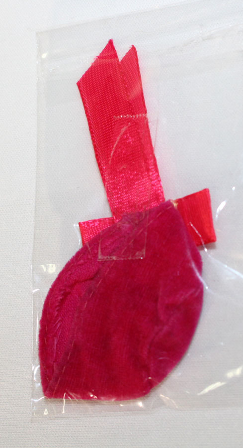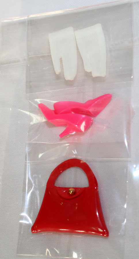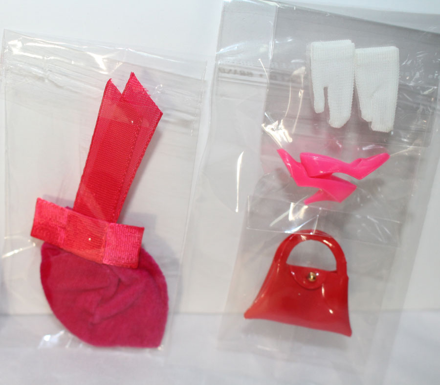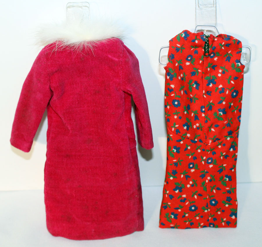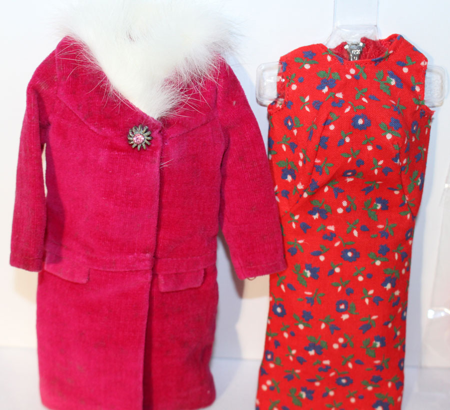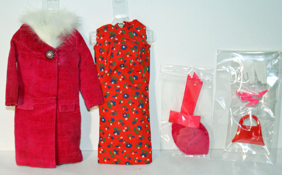 Magenta velvet coat with white fur trim and jeweled button closure. Red flowered sleeveless dress with blue and green flowers. Includes darling magenta hat with back bow, red purse, white short gloves and hot pink CT shoes. Pictured in the Barbie In Japan Book on pg 130. EC+++