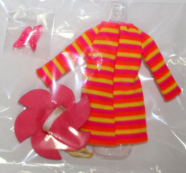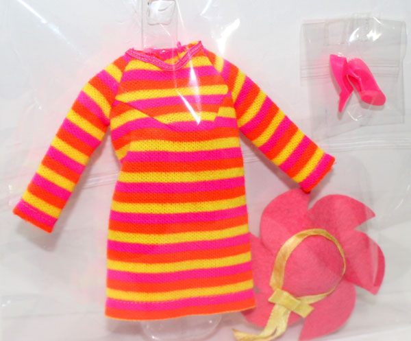 Japanese bright neon orange, hot pink and yellow vertical striped shift dress with matching pink felt hat with yellow ribbon and closed toe hot pink shoes. Pictured on page 129 in BIJ book. Mint.