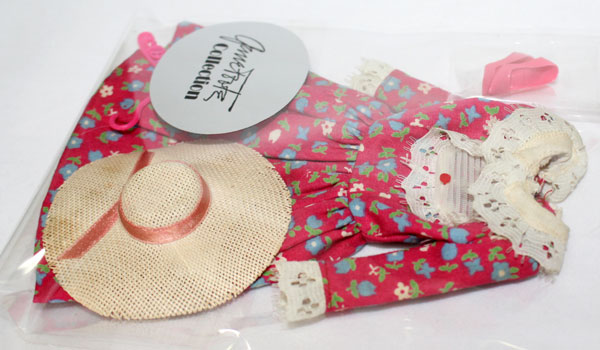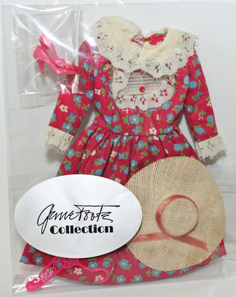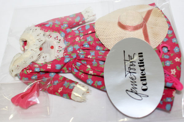 Magenta longsleeved flowered day dress with wonderful nylon bib, lace cuffs and collar, straw hat and matching coral closed toe shoes. Pictured on page 79 bottom left in red TNT box of the “Barbie In Japan” book. EC/NM.