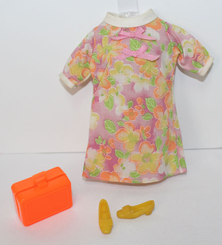 Day dress with short sleeves and mauve, yellow /orange flowers, white trim on collar and sleeves with two pink bows on bodice. Orange case and yellow square bow shoes.