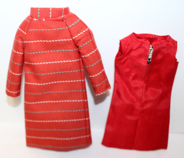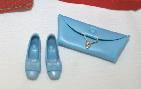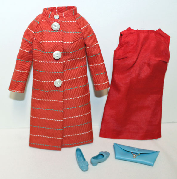 Rust colored coat with matching sleeveless dress. Blue envelope purse and blue soft bow shoes. Mint.