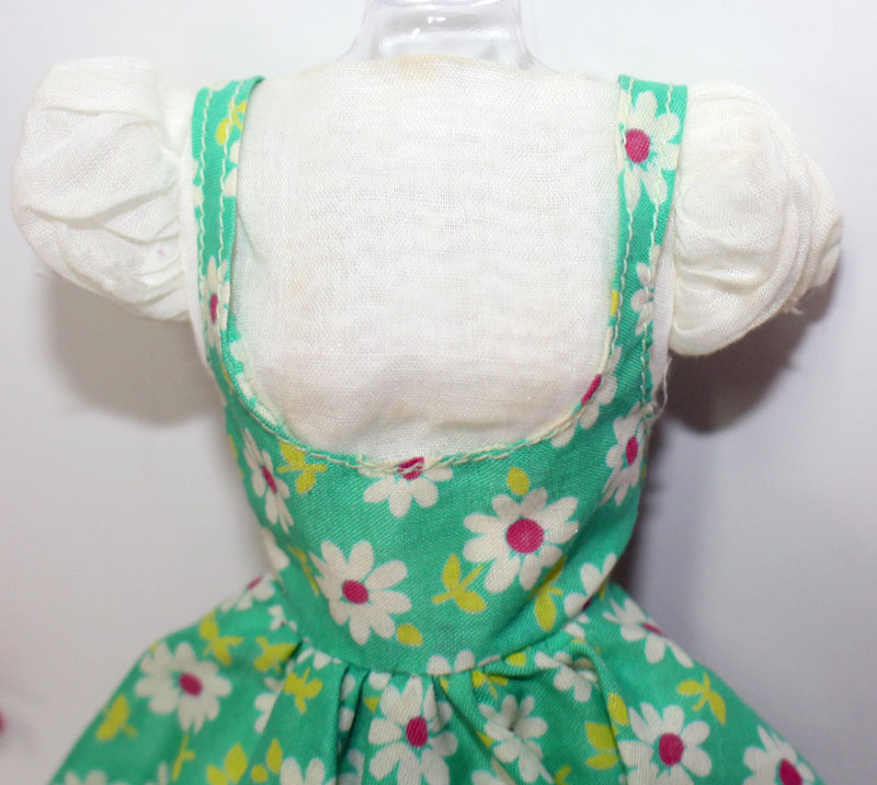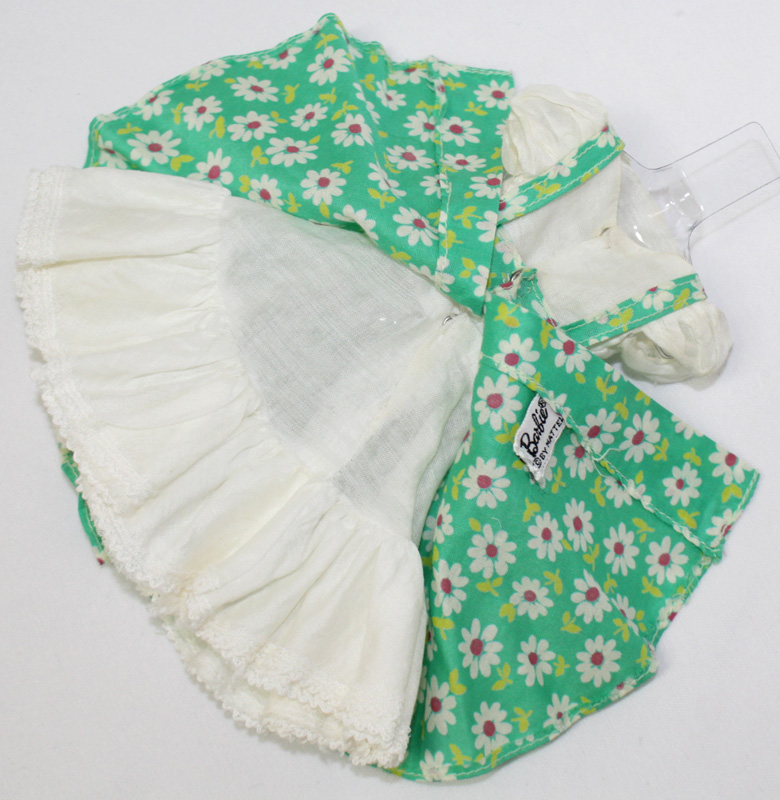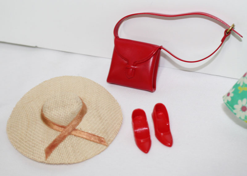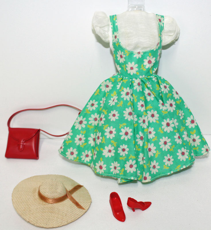 Japanese version of Friday Night Date. Green background with white flowers with red centers and yellow stems. Pages 82 & 135 in “Barbie In Japan book. Red closed toe shoes, straw hat with red ribbon trim and red shoulder purse. Dress is Mint and Blouse NM.