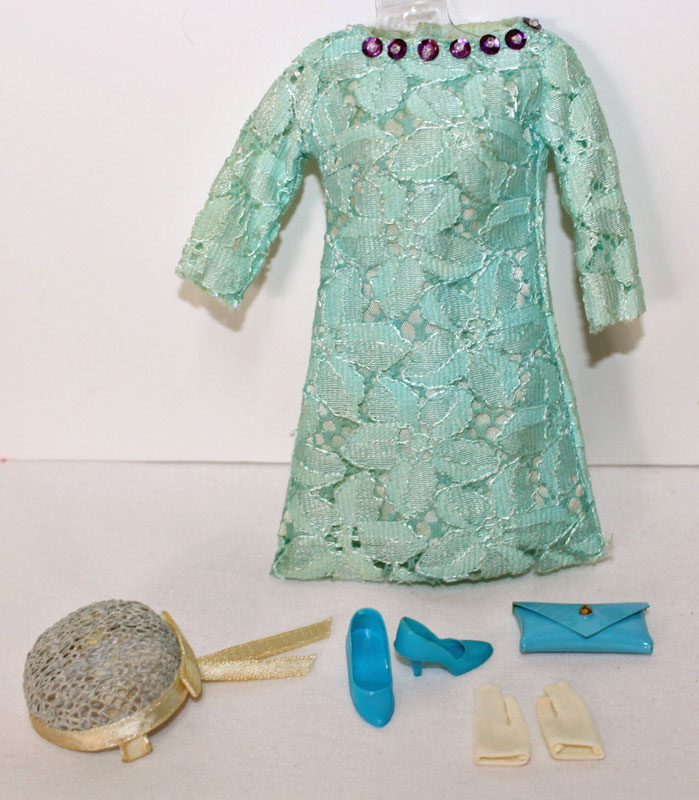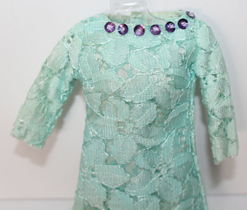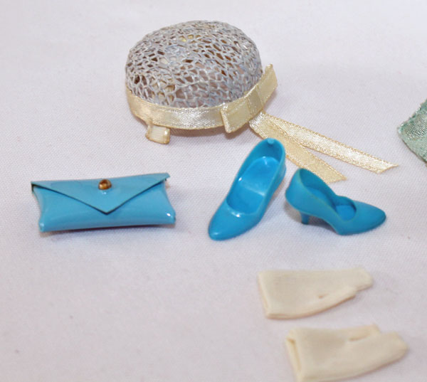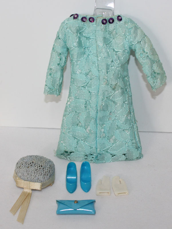Aqua long sleeved lace dress with purple sequins at the neck and back of the neck. There is one sequin missing in the back. Round blue lacey hat with white satin trim. Aqua small VHTF purse with matching aqua closed toe shoes. EC++++