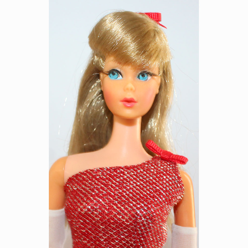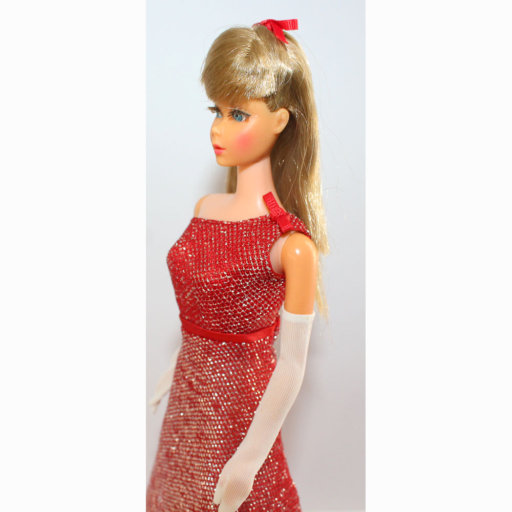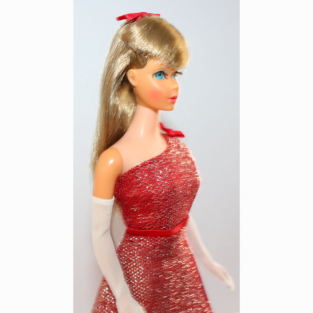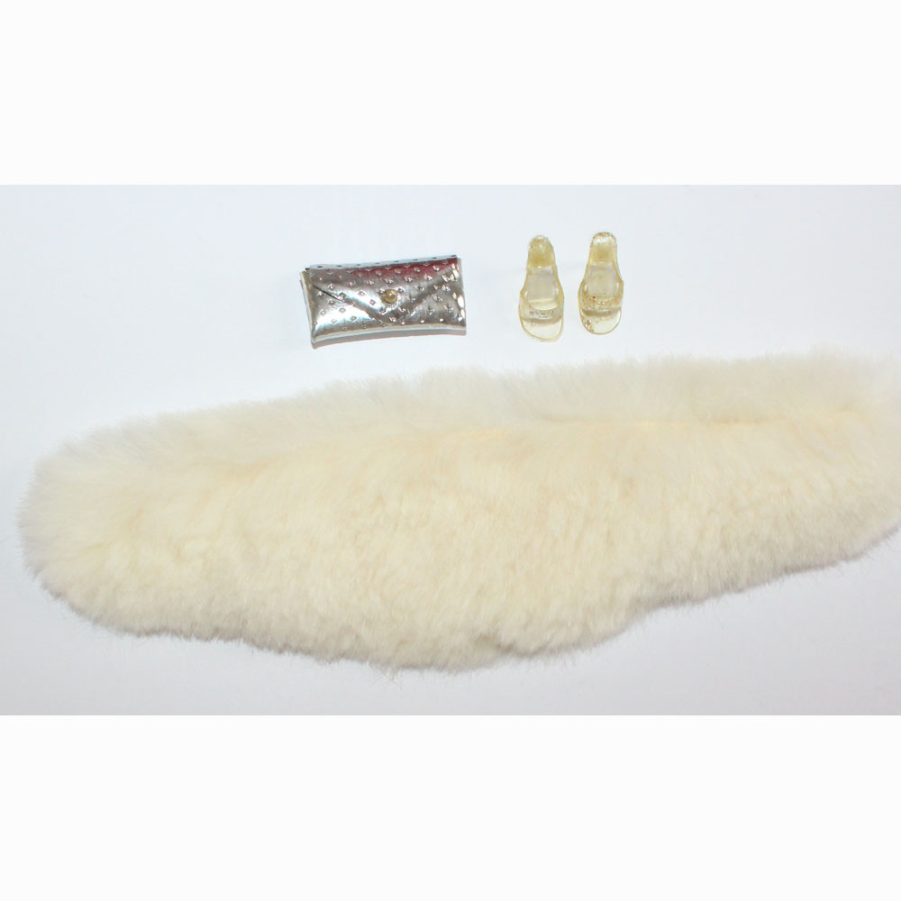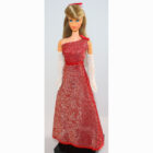 Gorgeous red glittery one shoulder gown with white thick fur stole, long white gloves, silver purse and open toe silver glitter shoes.ย Included is an ash blonde mint TNT. Mint everything.
