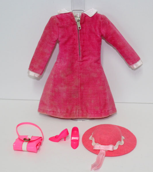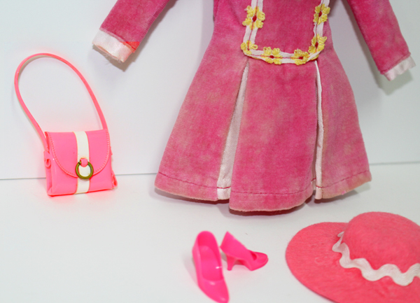Pink velvet long sleeved dress with white satin collar and tie, yellow flower trim-bib and white cuffs. Matching pink felt brimmed hat with white bric a brac trim and pink bow. Cutest pink with white stripe shoulder purse and pink closed toe shoes. The dress has faded marks all over it front and back. Everything else is Mint.
