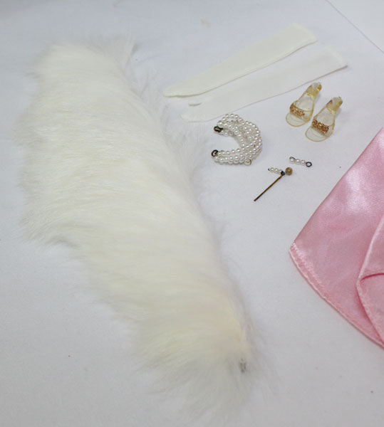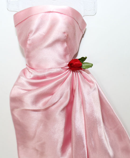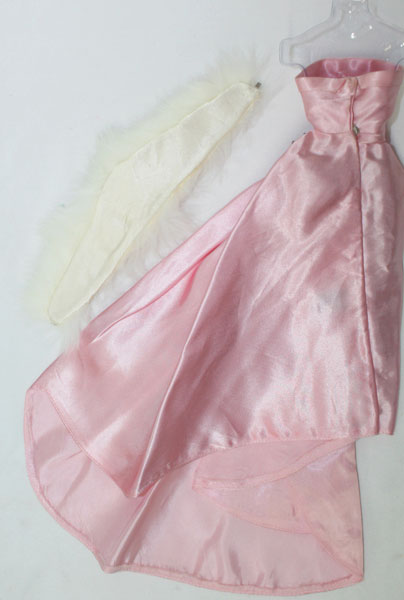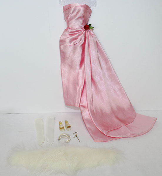 Bright pink Enchanted Evening with JE thicker fabric with the Solo red rose, white fur stole, white long gloves, all jewelry and clear open toe shoes with gold sparkles. C/Mint!