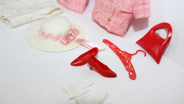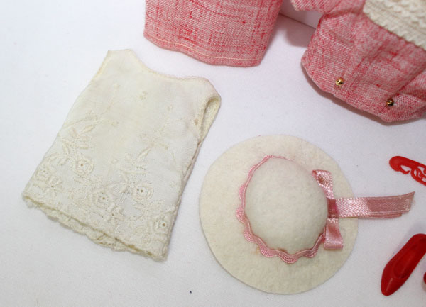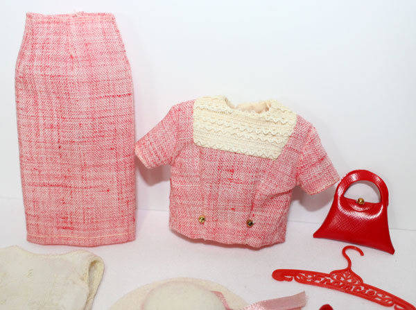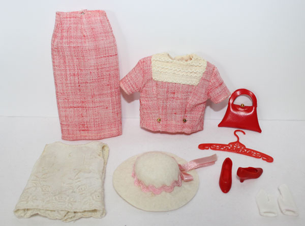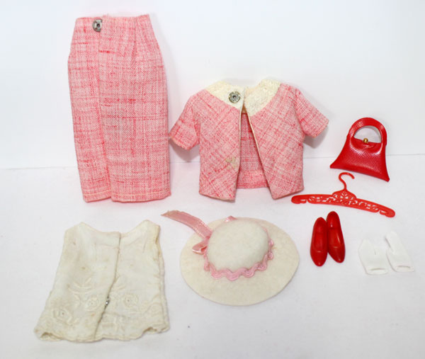 What a wonderful Francie summer suit! Darling light red summer suit. Exclusive to Japan only. It is in near mint condition and comes with a white felt hat and pink ribbon, red soft heels, white short gloves, red purse, white sleeveless top and the two piece suit. The suit jacket has two gold round buttons on the front. Needs a snap on back of top. C/NM.