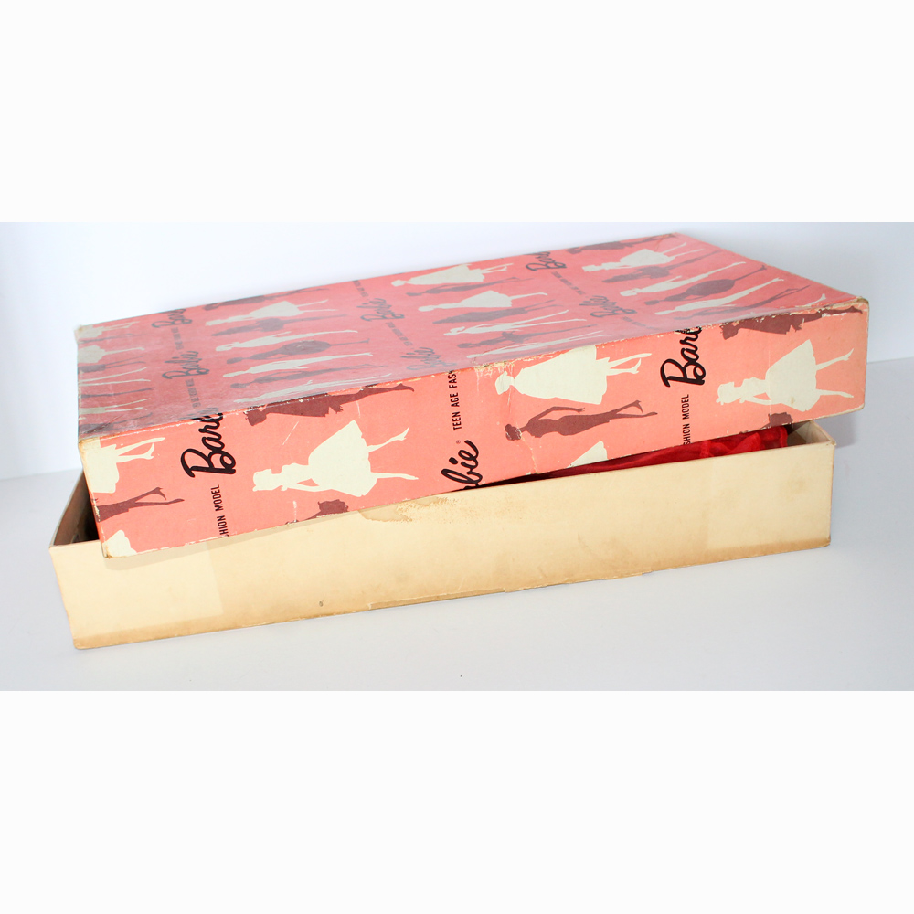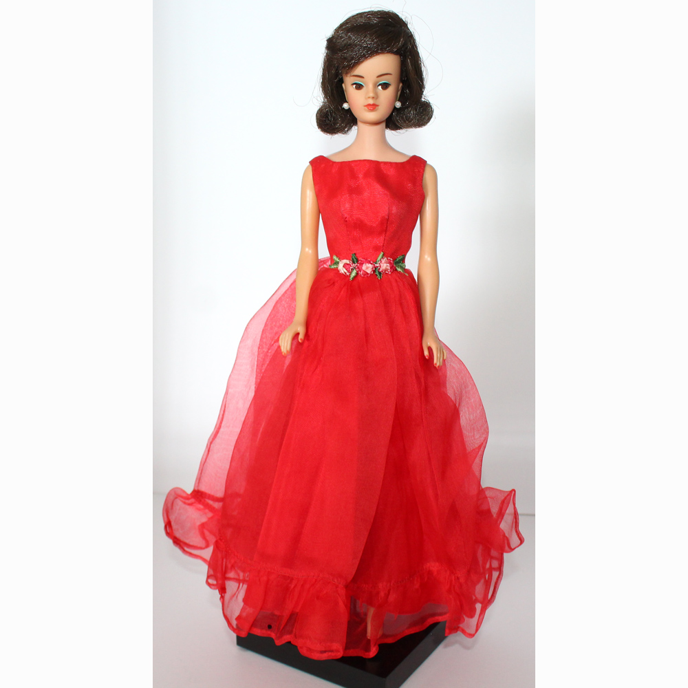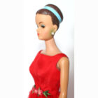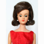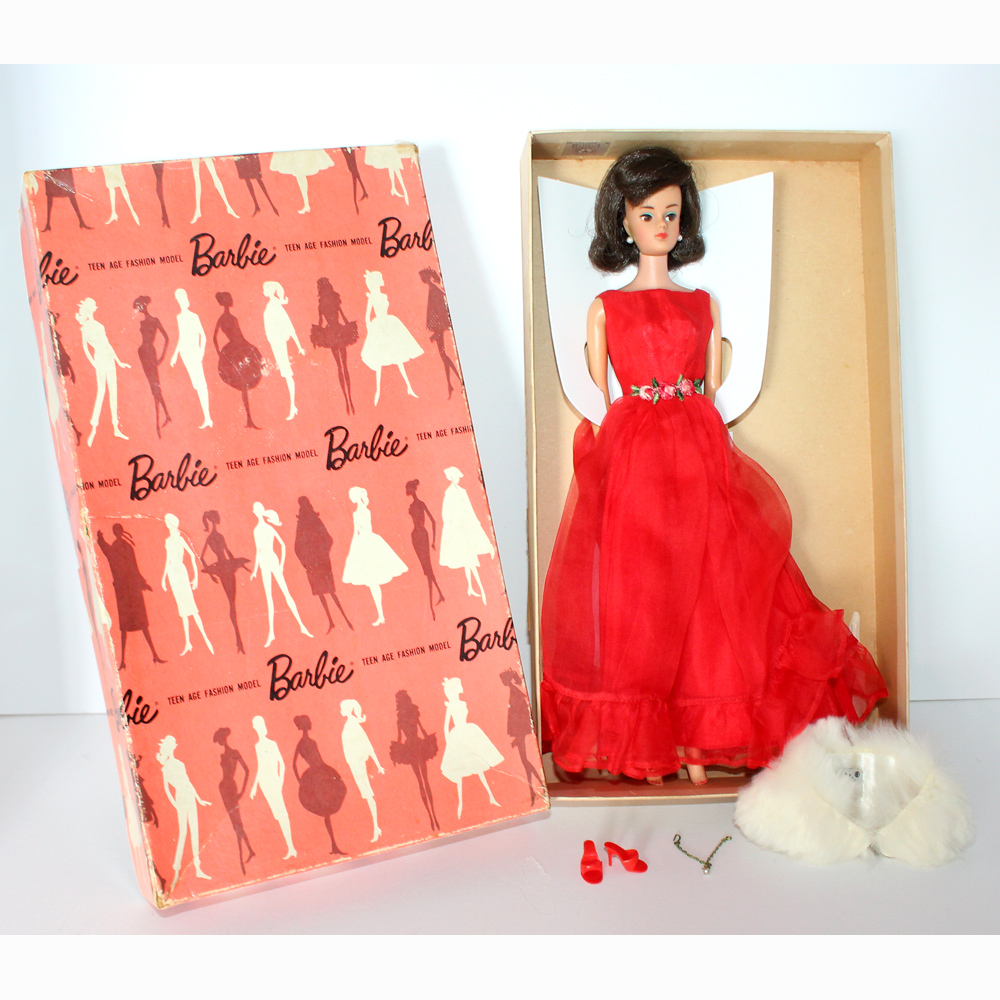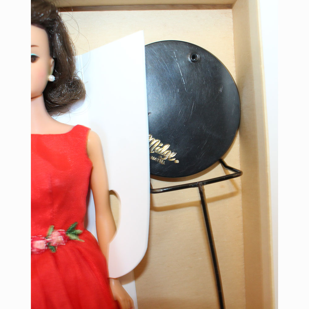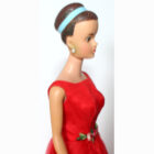 Dressed in #1614 JE Junior Prom (C/NM/M). She has been green treated and there is still a shadow. It’s very common for these dolls to have green. Her lips are coral and all there. She has her gown, brunette wig, JE Midge stand with gold writing, sunglasses, one pearl chain necklace, gloves and fur stole. The box is in EC to NM condition and is very bright and beautiful. She has all her nail and toenail polish. NM/M