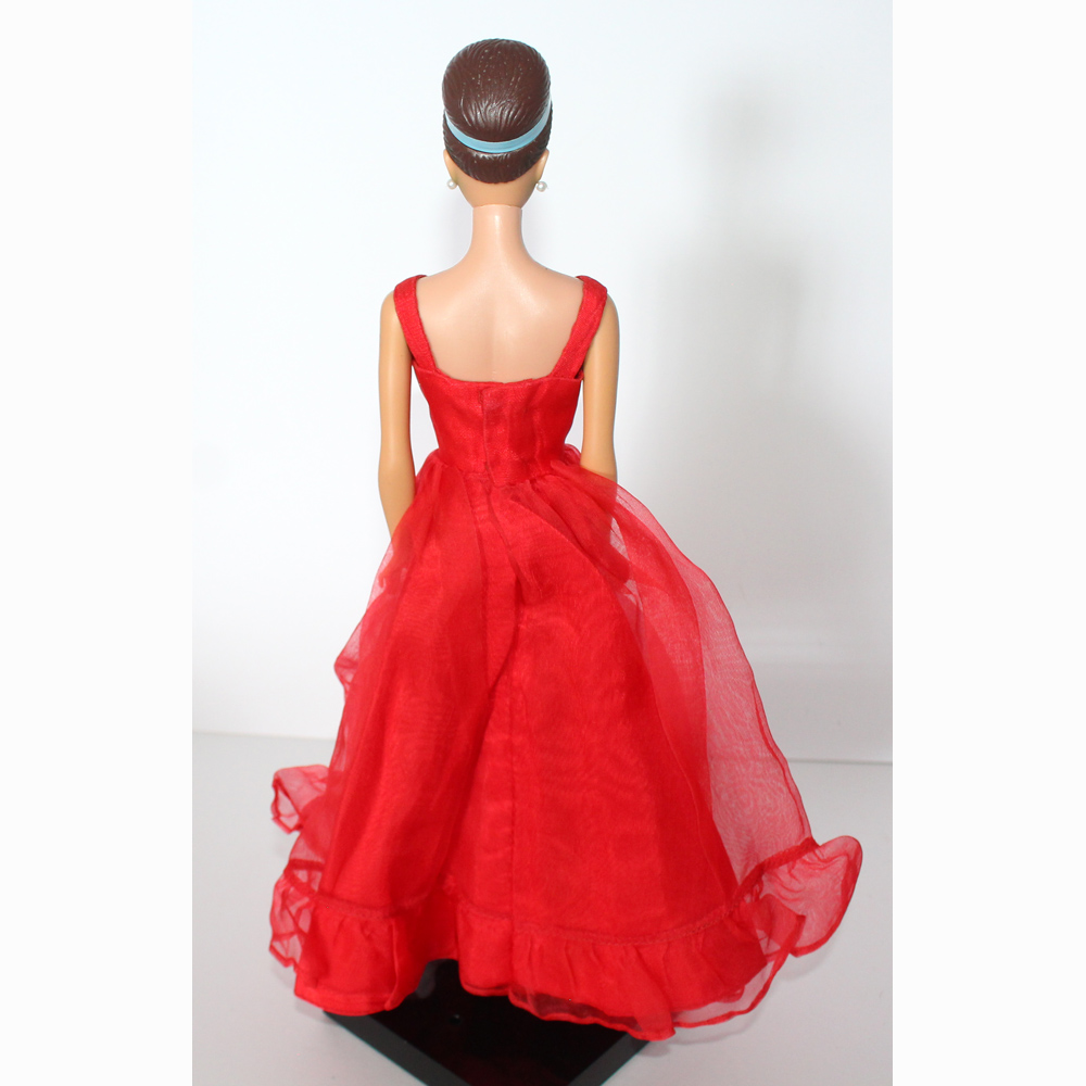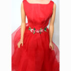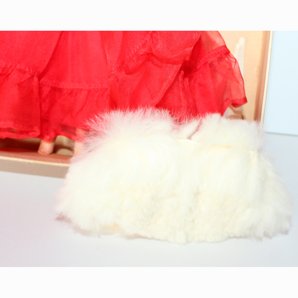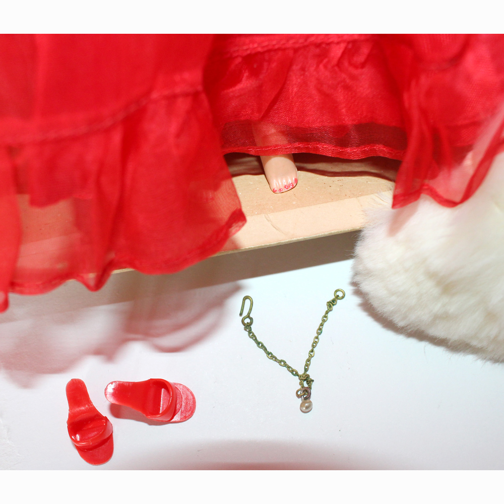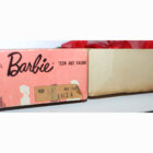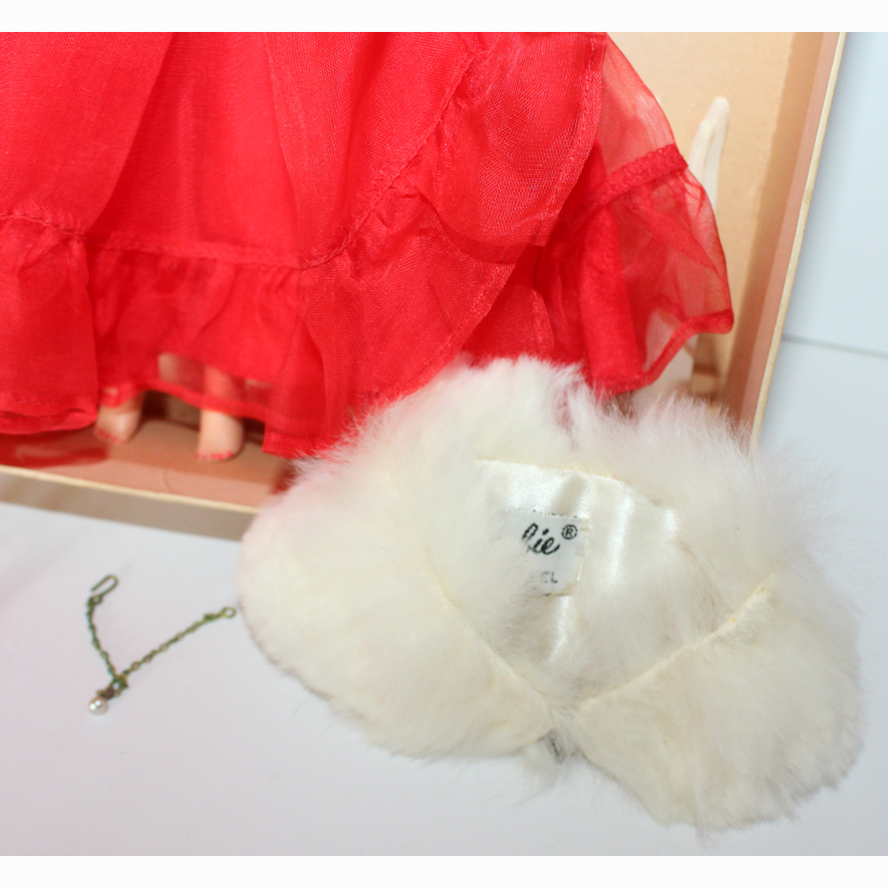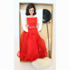 Dressed in #1614 JE Junior Prom (C/NM/M). She has been green treated and there is still a shadow. It’s very common for these dolls to have green. Her lips are coral and all there. She has her gown, brunette wig, JE Midge stand with gold writing, sunglasses, one pearl chain necklace, gloves and fur stole. The box is in EC to NM condition and is very bright and beautiful. She has all her nail and toenail polish. NM/M