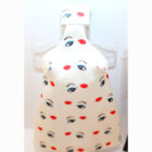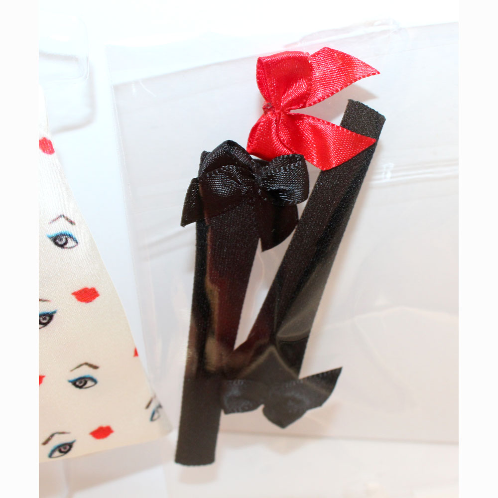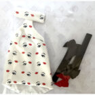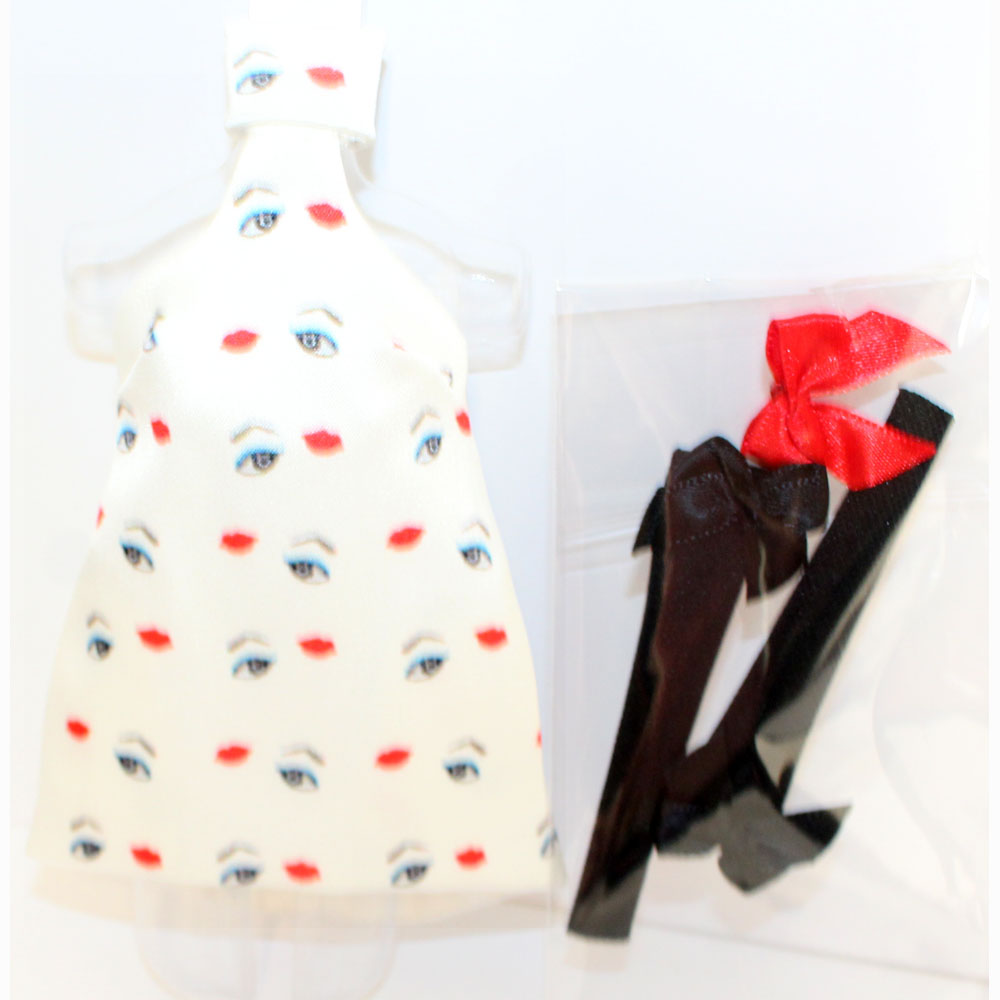 White short dress with lips and eyes printed on, made in a 98% polyester and 2% elastane fabric, 100% polyester lining and 5mm single metal hook closure, gloves with bow detail made of 100% polyester.