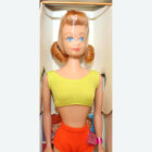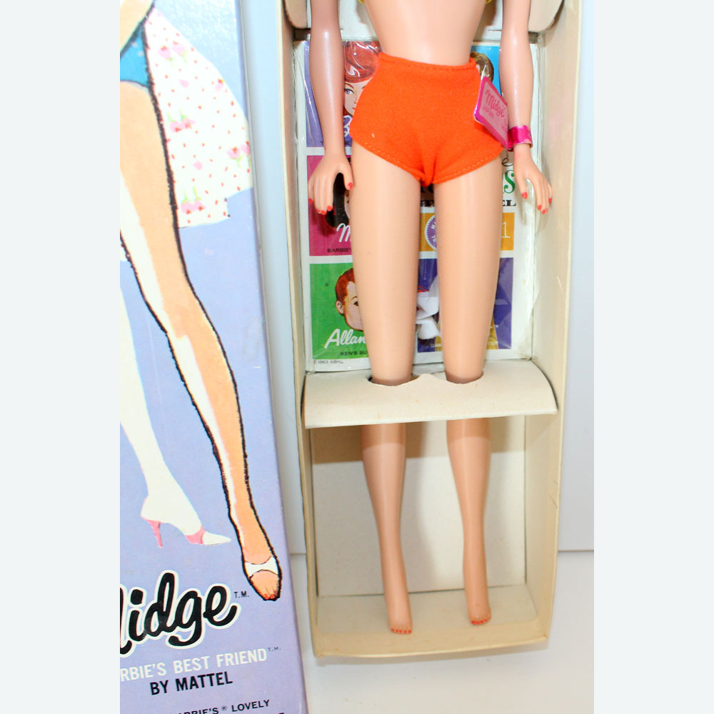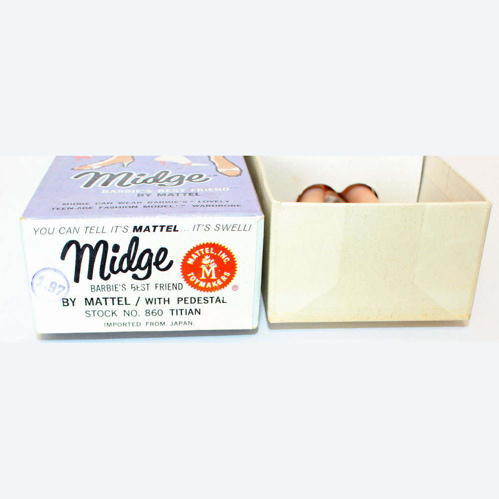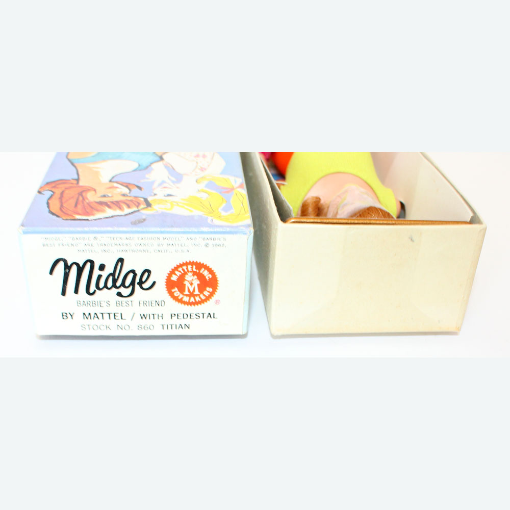 This is a Vintage Titian Midge Doll. Her hair has not been cut and there are no missing hair plugs. Her hair is long and she has nice bangs and great curls around her face. She has her original two piece mint swimsuit, lime and orange. Her makeup is original. She has no earring holes, green ear, or neck splits. Her body is in great condition and she has all her polish. There are no pin pricks or chews. She is in her Mint box that says Titian and has her original booklet and shoes. MIB