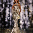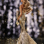 Opulent golden strapless gown with oversized bow detail at the waist, made of sumptuous Jason Wu custom couture fabric;