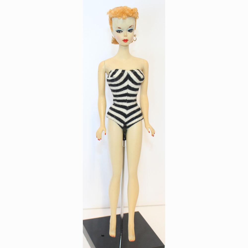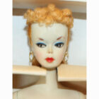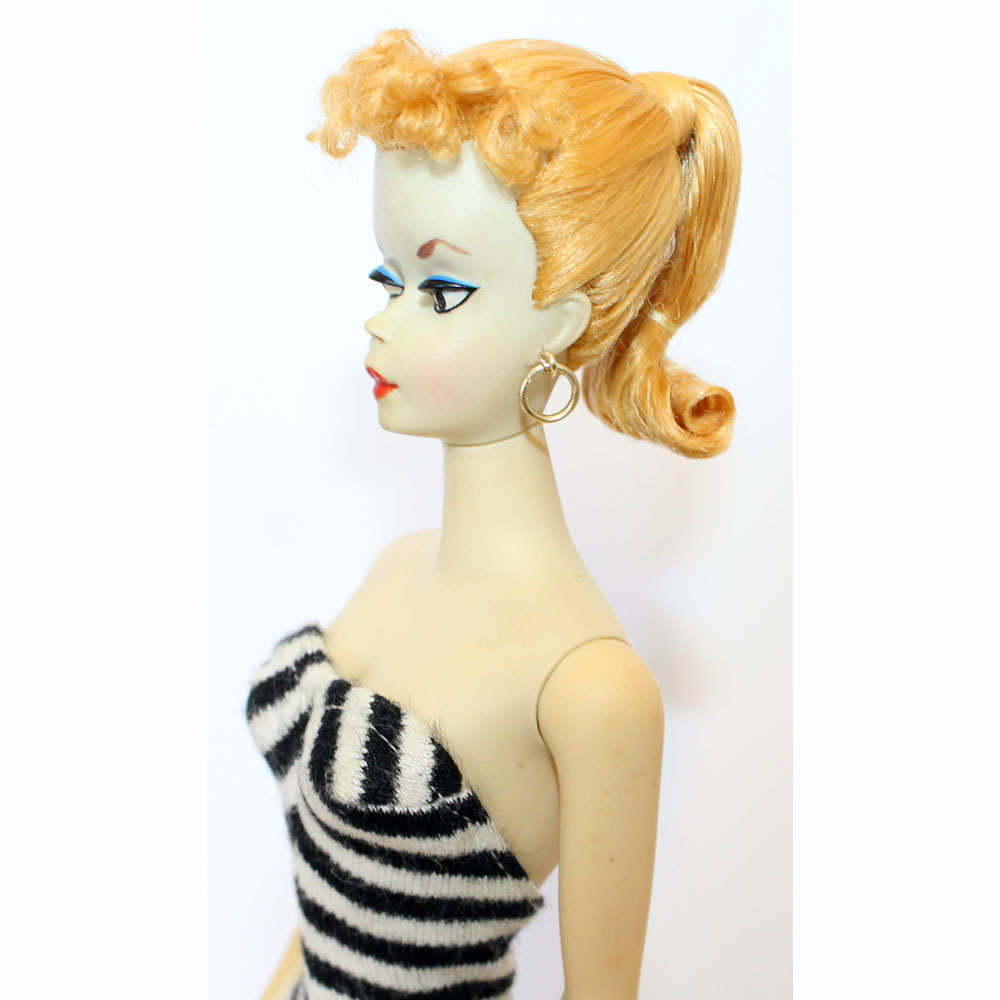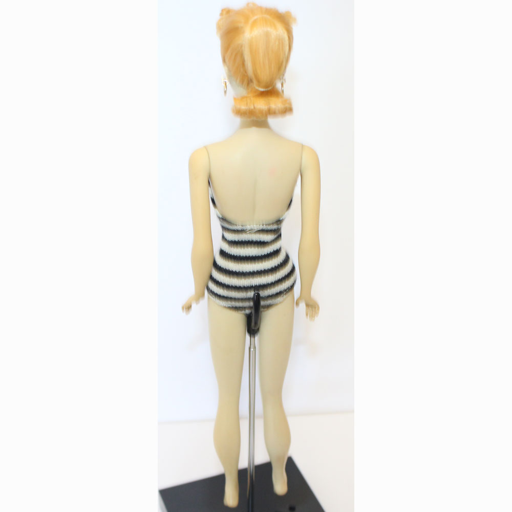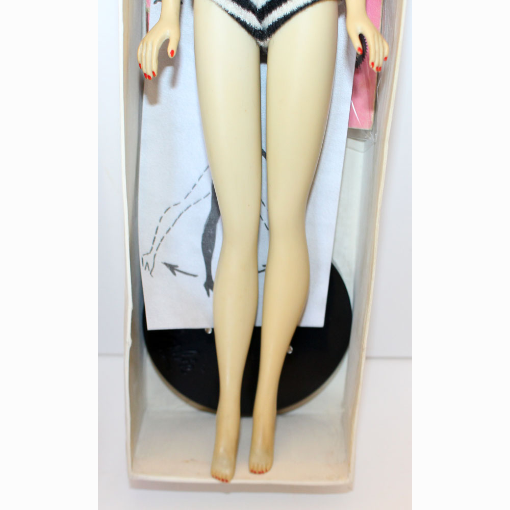 This is a Number One Blonde Hand Painted Barbie doll. She has her original swimsuit. The doll is gorgeous with some rosy cheeks, shiny hair and nice red lips. Her complexion is creamy, with a slight mark on her back. Nice curly bangs with good nail and toe polish. She’s a stunning doll. There is no green or ever was.ย You can see the brush strokes on her eyebrows. She is a beauty and definitely a hand painted one of a kind number one. She comes with her original head liner, stand, booklet, shoes, sunglasses, NM box.