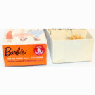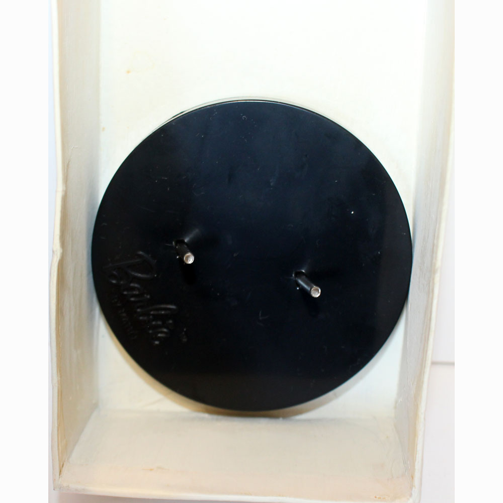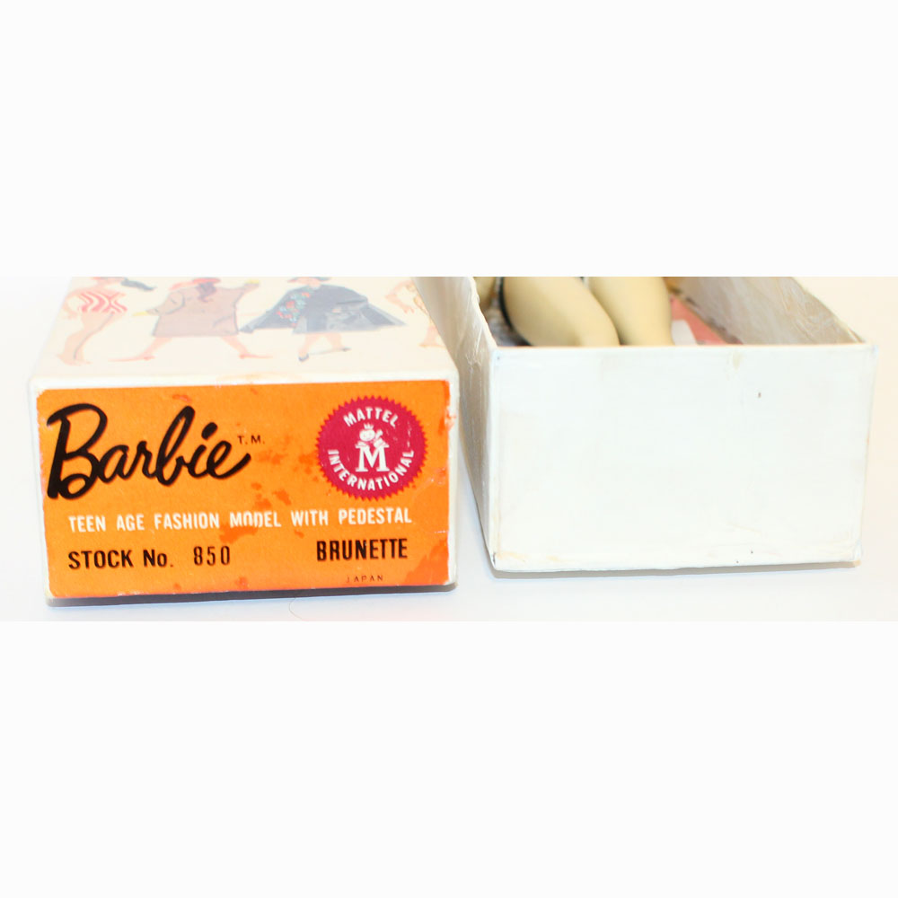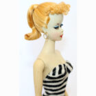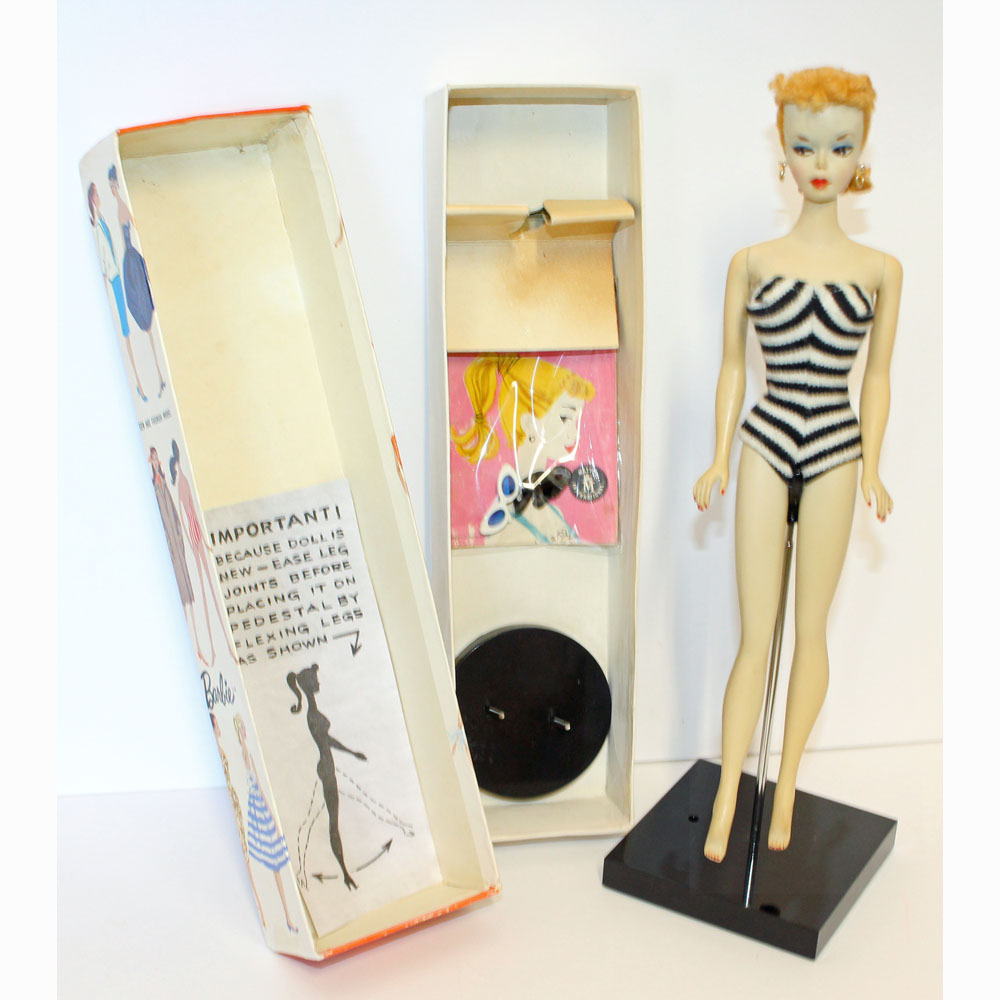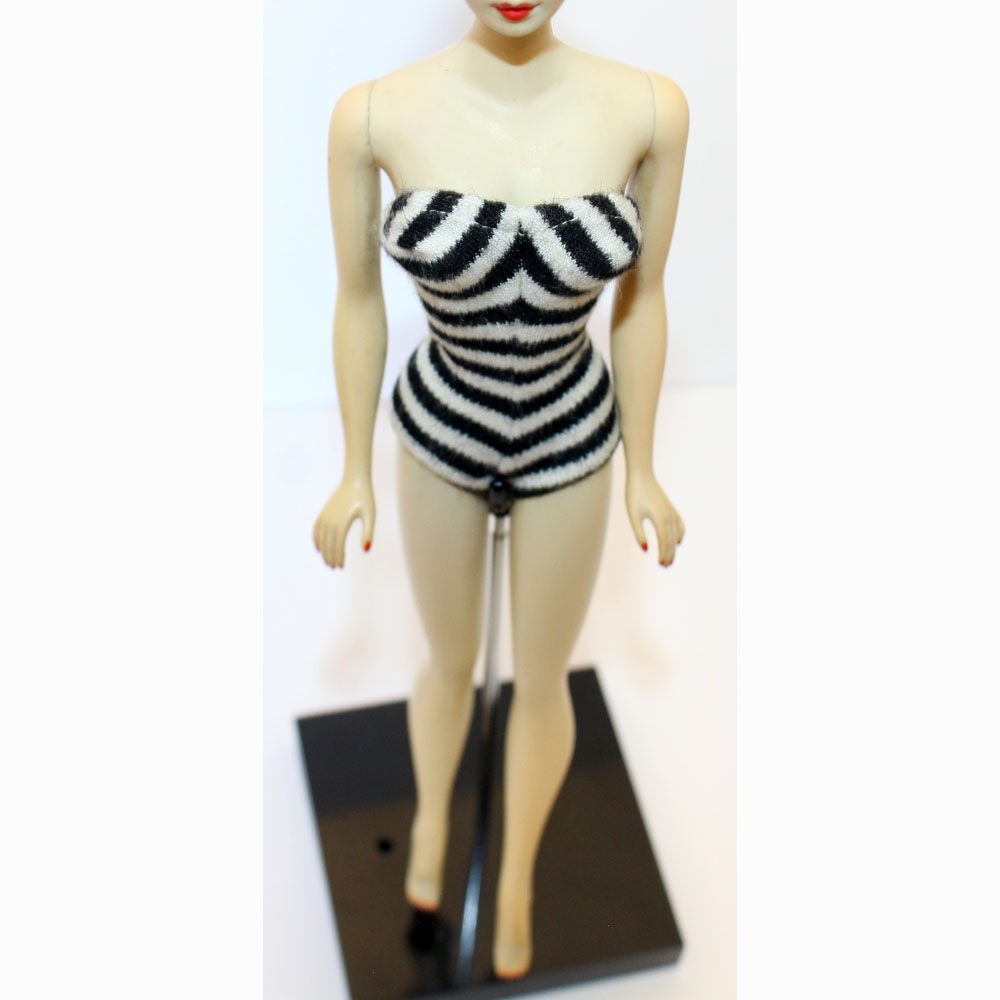 This is a Number One Blonde Hand Painted Barbie doll. She has her original swimsuit. The doll is gorgeous with some rosy cheeks, shiny hair and nice red lips. Her complexion is creamy, with a slight mark on her back. Nice curly bangs with good nail and toe polish. She’s a stunning doll. There is no green or ever was.ย You can see the brush strokes on her eyebrows. She is a beauty and definitely a hand painted one of a kind number one. She comes with her original head liner, stand, booklet, shoes, sunglasses, NM box.