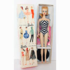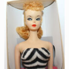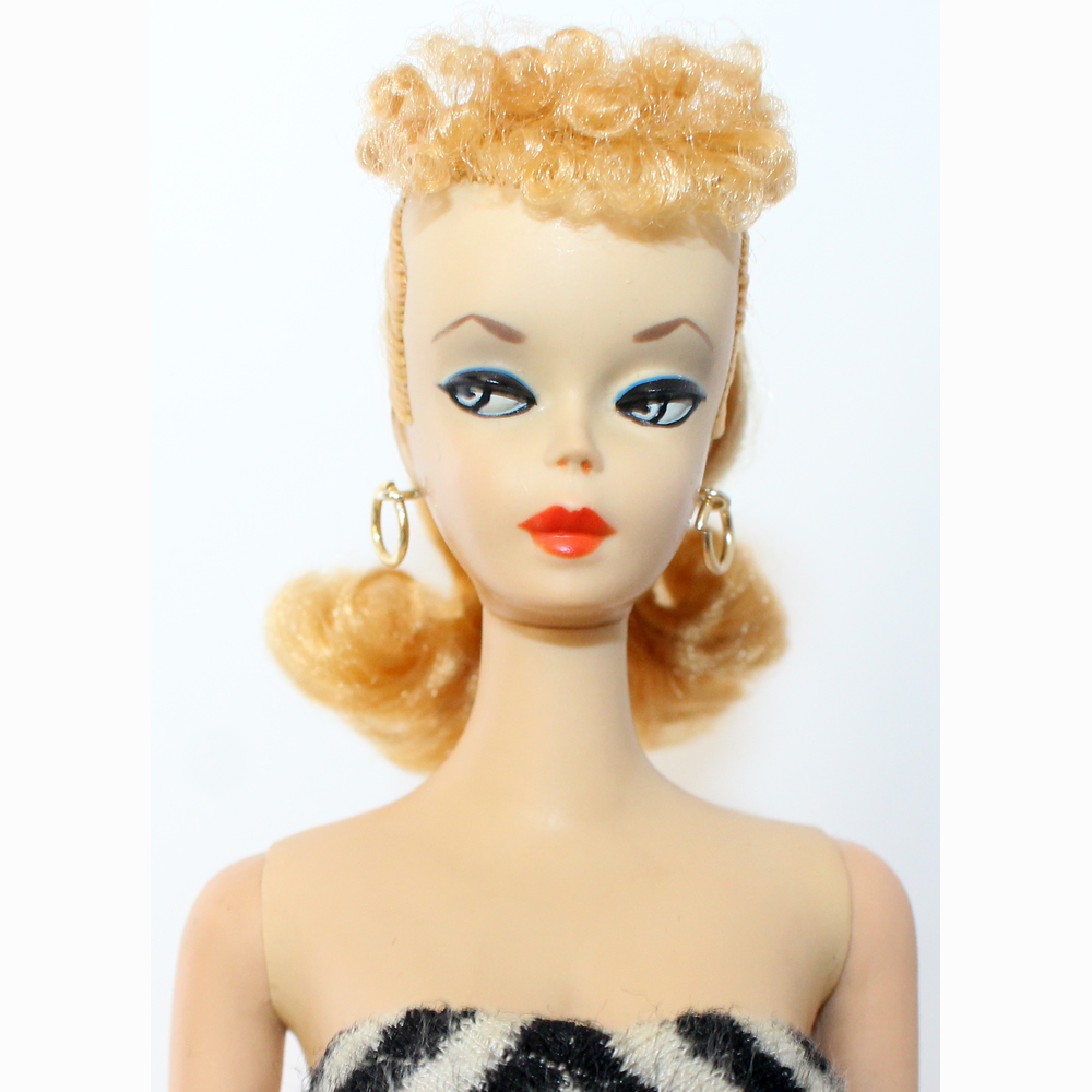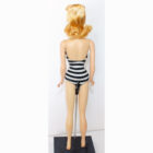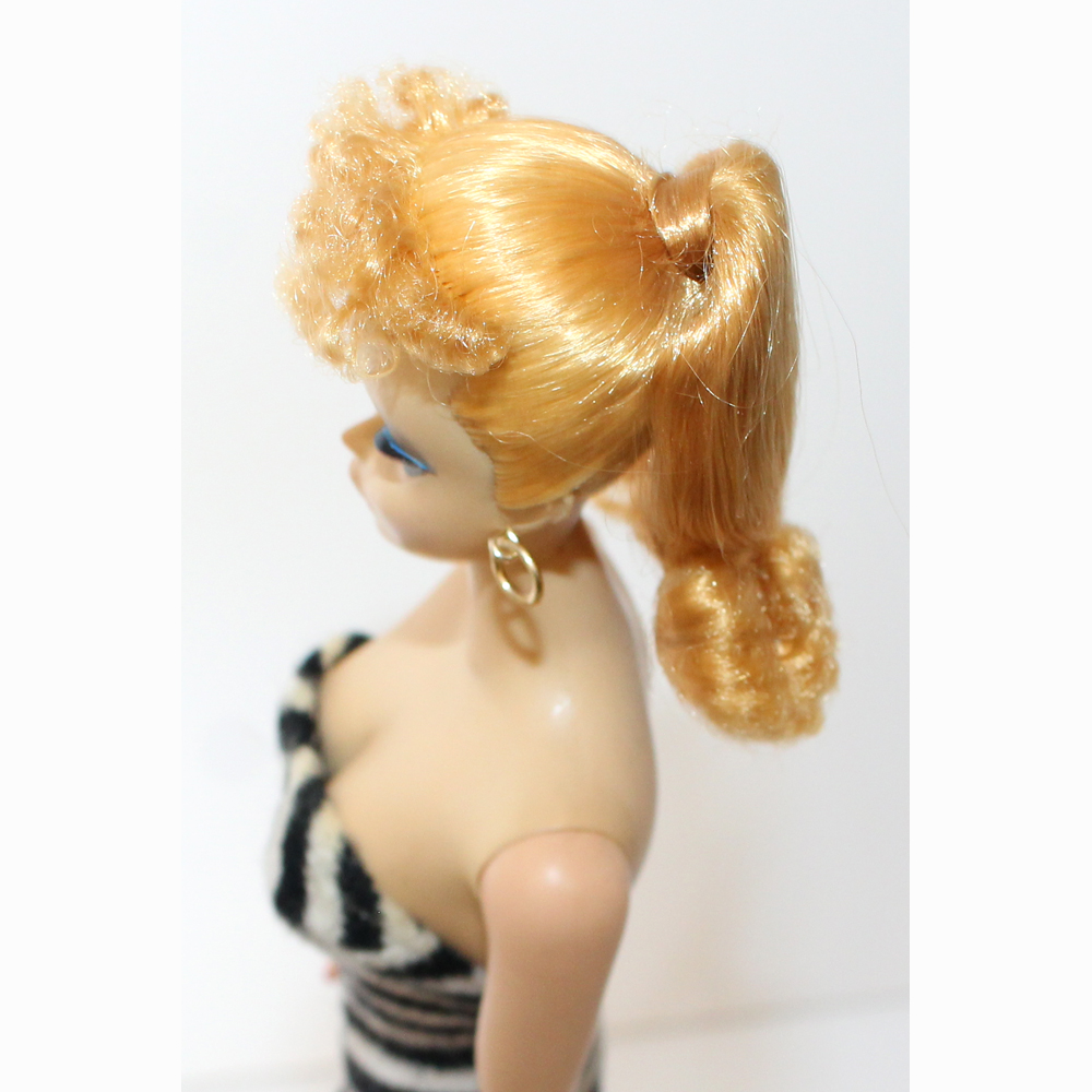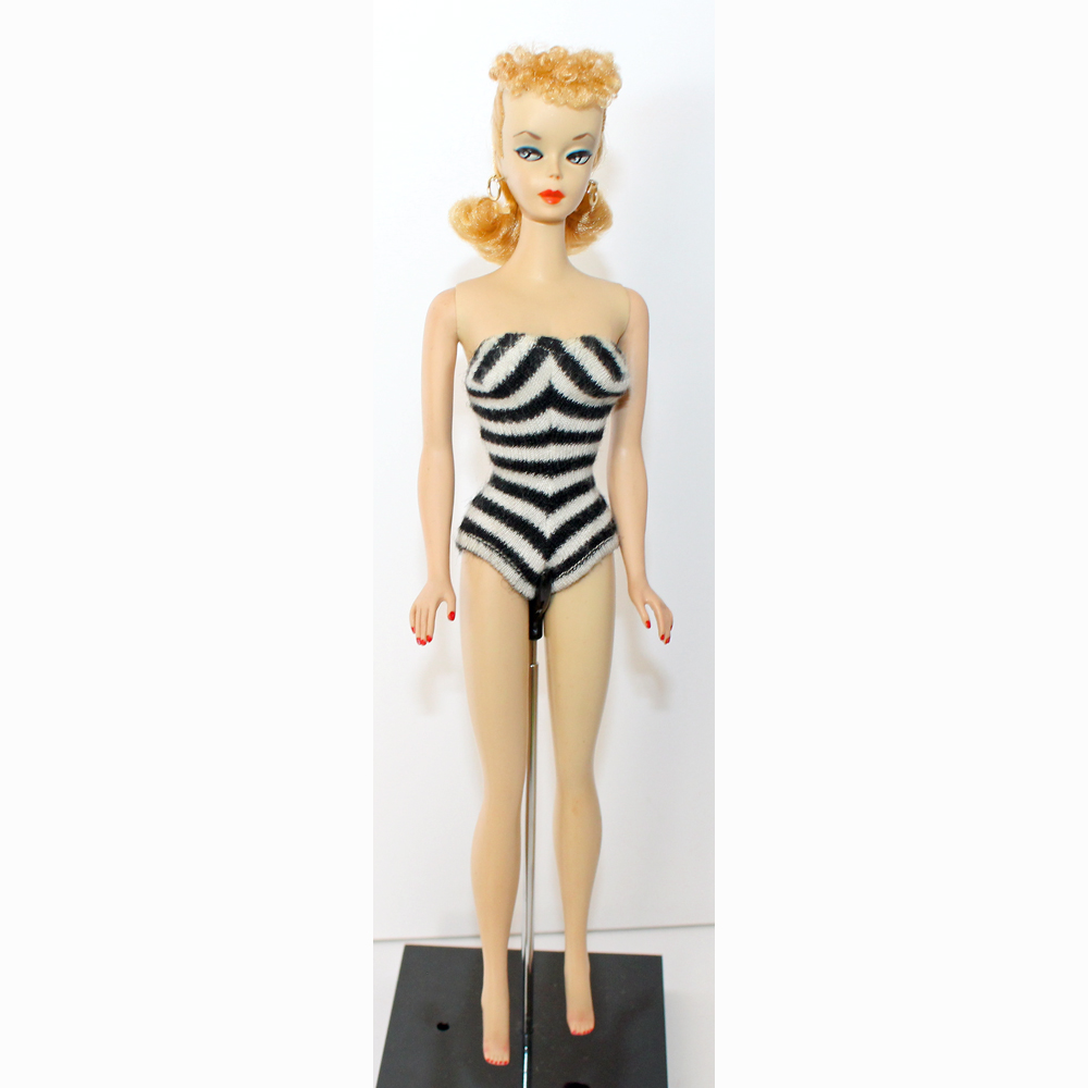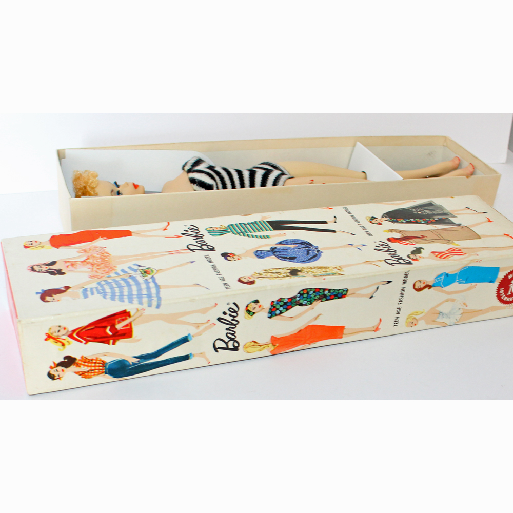 This is a Number 1 Blonde Barbie. She wears her zebra original swimsuit with her hoop earrings. Her face is all original and so is her makeup. Touches of rosy cheeks and gorgeous red orangy lips. ORIGINAL booklet is like brand new, sunglasses, #1 shoes, “TM” NM/Mint box and original stand. She has a very long ponytail with thick bangs and very long ponytail and a replica paper that states “IMPORTANT” about her joints. This Number One is a one of a kind and her beauty is impeccable. She came from her original owner and was never played with. She has her original top wrap and parts of the bottom wrap. A doll like this is so hard to find in mint condition. MIB.