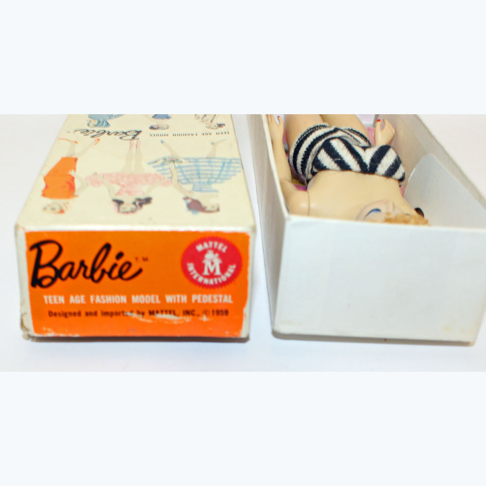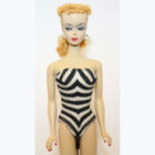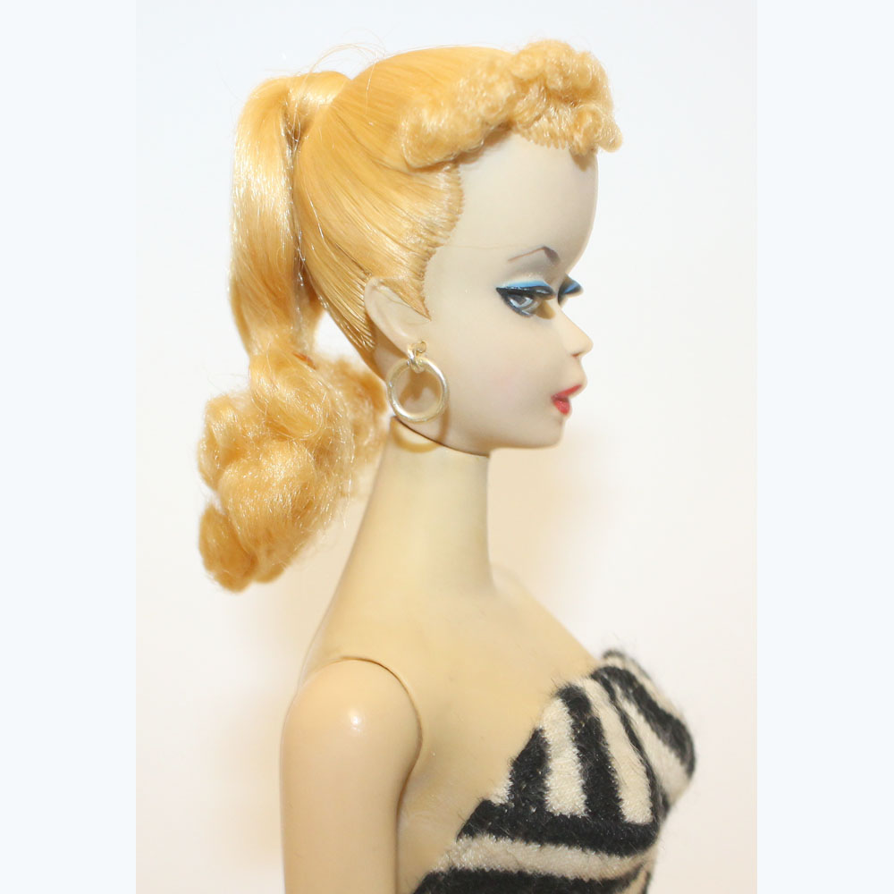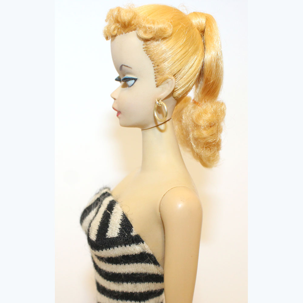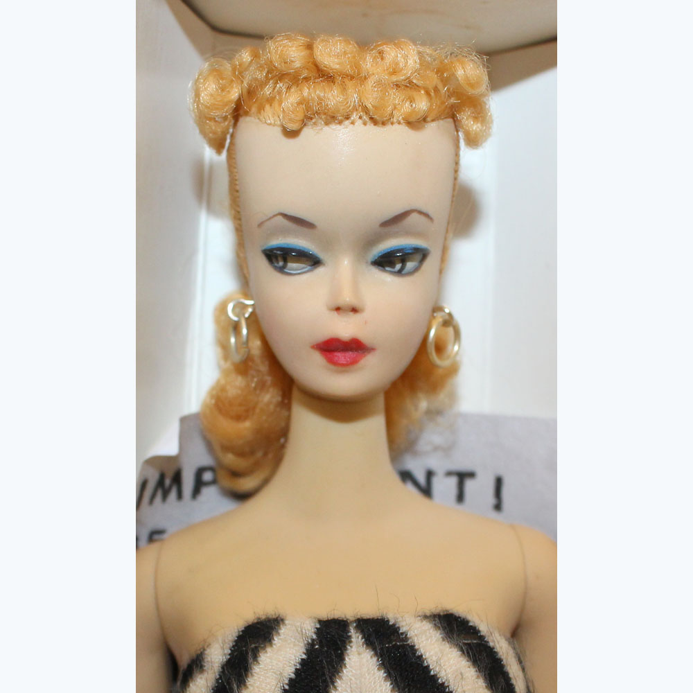 This is a 1959 Number 1 Blonde Barbie. She wears her zebra original swimsuit with her hoop earrings. She has touches of original rosy cheeks and creamy/pink even skin tone and nice red lips, “TM” booklet, sunglasses, #1 shoes, “TM” EC box, and original mint #1 stand. She has her replica paper that states “IMPORTANT” about her joints. This Number One is a one of a kind! She has 2 small dots on the back of her left arm.ย She has everything and she is MIB.ย