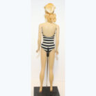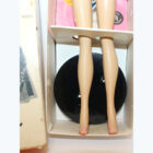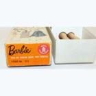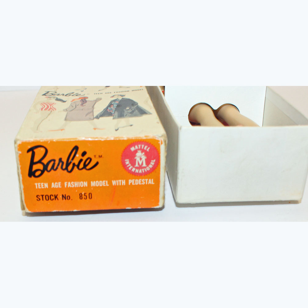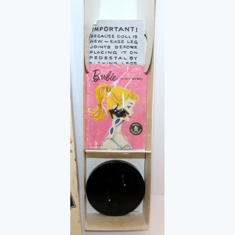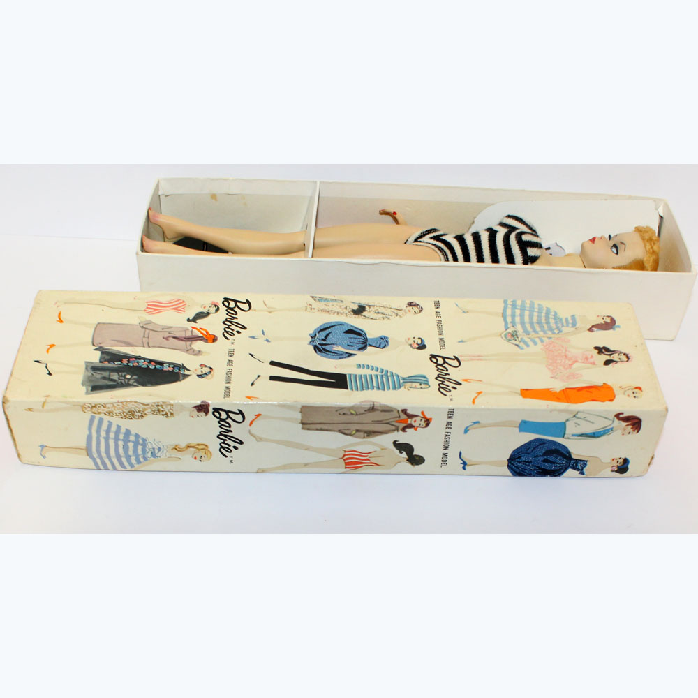 This is a 1959 Number 1 Blonde Barbie. She wears her zebra original swimsuit with her hoop earrings. She has touches of original rosy cheeks and creamy/pink even skin tone and nice red lips, “TM” booklet, sunglasses, #1 shoes, “TM” EC box, and original mint #1 stand. She has her replica paper that states “IMPORTANT” about her joints. This Number One is a one of a kind! She has 2 small dots on the back of her left arm.ย She has everything and she is MIB.ย
